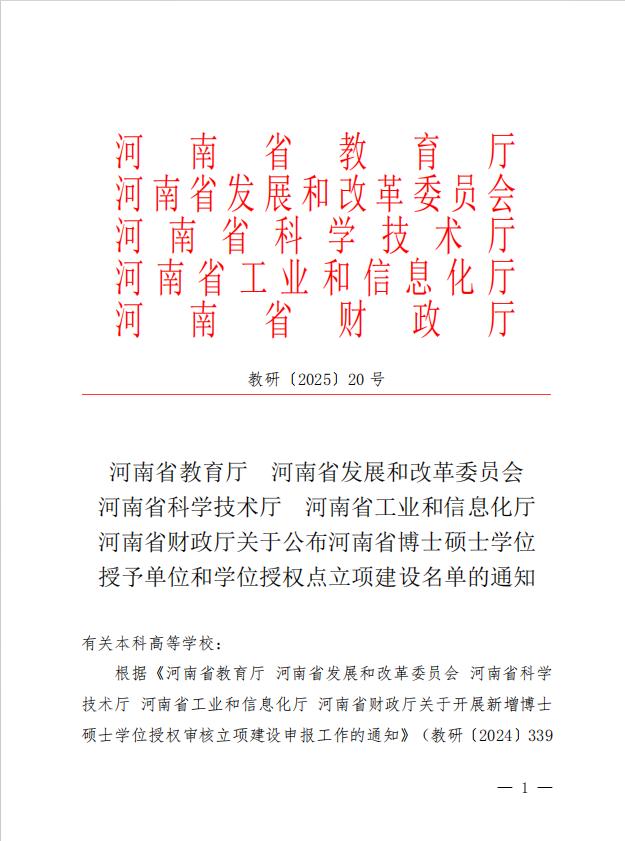 据悉,本次获批硕士学位授权点立项建设是根据《河南省教育厅 河南省发展和改革委员会 河南省科学技术厅 河南省工业和信息化厅 河南省财政厅关于开展新增博士硕士学位授权审核立项建设申报工作的通知》(教研〔2024〕339号),经过学校申报、专家通讯评议和现场评审等环节而最终确定的。