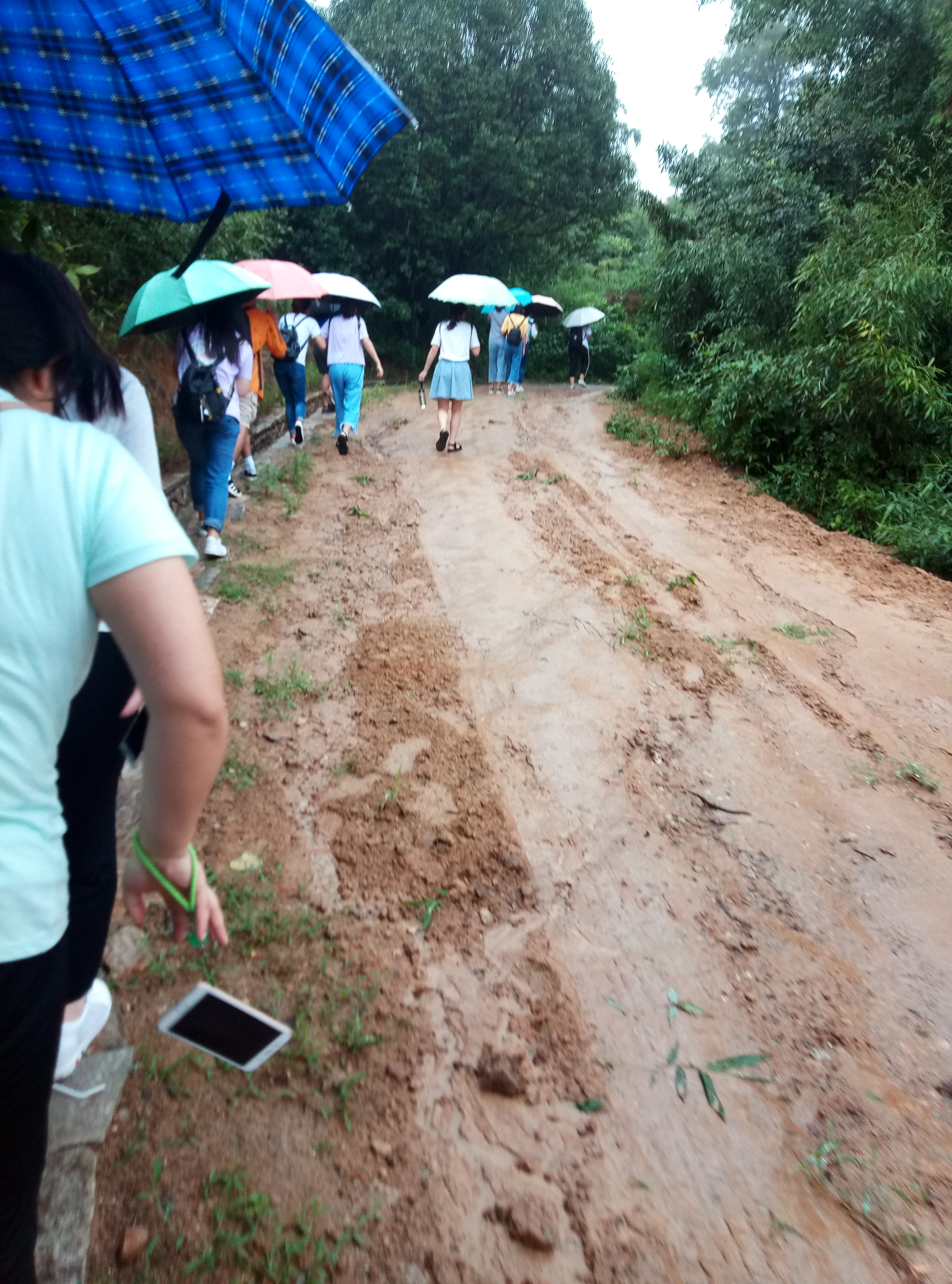 韩山村是国家级传统村落,距今有800年历史。瓢泼大雨中,同学们踩着泥泞的山路慢慢往上走,不一会就进入到了韩山村,映入眼帘的是郁郁葱葱、叫不上名儿的绿树,往前走,在村口迎接我们的是新县树王博物馆。负责看馆的韩大爷非常热情地招呼我们避雨。韩大爷说韩山村村里村外现有古树古木有149株,古树资源很丰富。国家建起了树王博物馆后,很多人都来参观,也带动了村里的经济,他希望村里的生活越来越好。