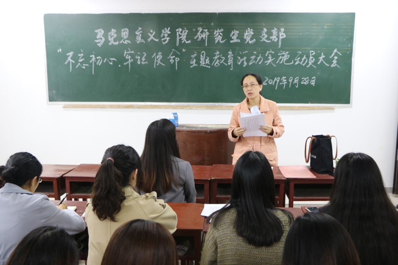 9月28日下午,beat365研究生党支部在教五楼201教室召开“不忘初心,牢记使命”主题教育活动实施方案动员大会,全体研究生党员和入党积极分子参加大会。会议由研究生党支部书记卢云晓主持。