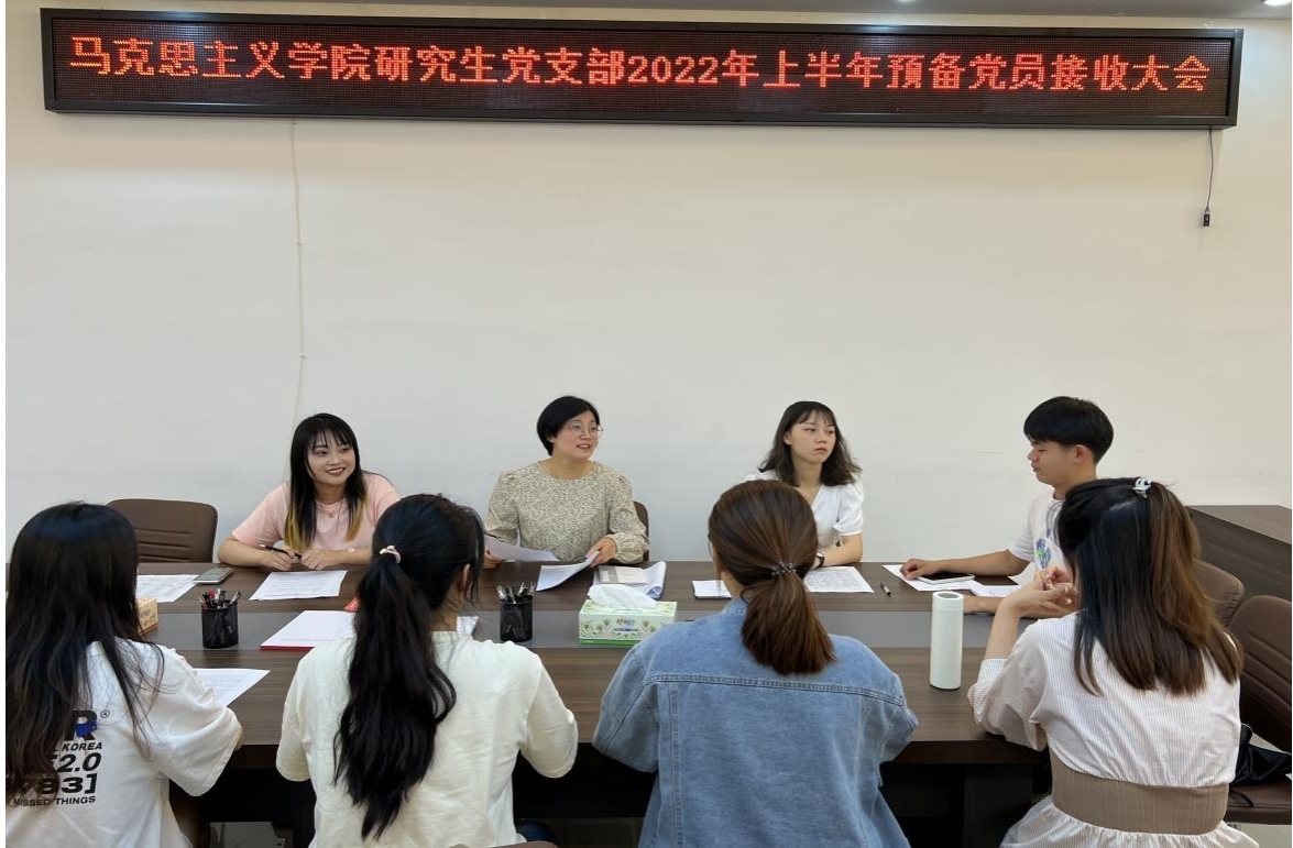 5月31日,beat365研究生党支部于社科楼323会议室召开2022年上半年预备党员接收大会,讨论了余欢欢、张蒙蒙、赵子剑、赵婧同、陶小颍、郭婉如、 喻泳成、葛鸿萍八位同志转为中共预备党员的问题。会议由支部书记郑晨霞同志主持,彭燕担任监票人,王澳远担任计票人。