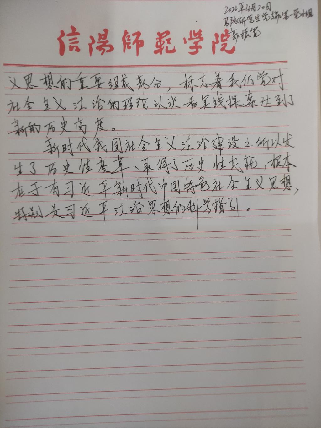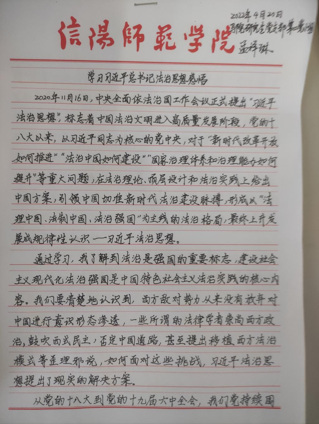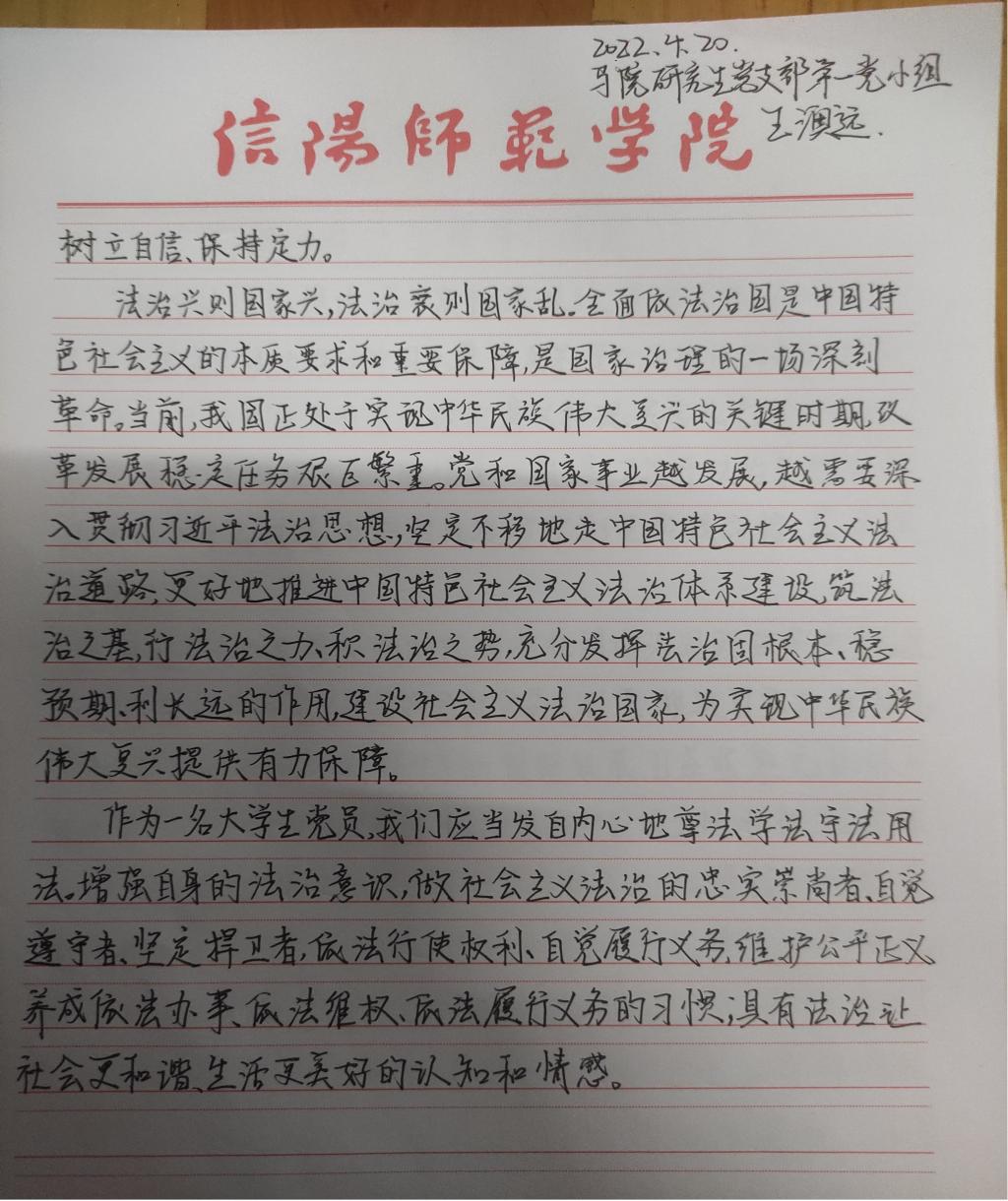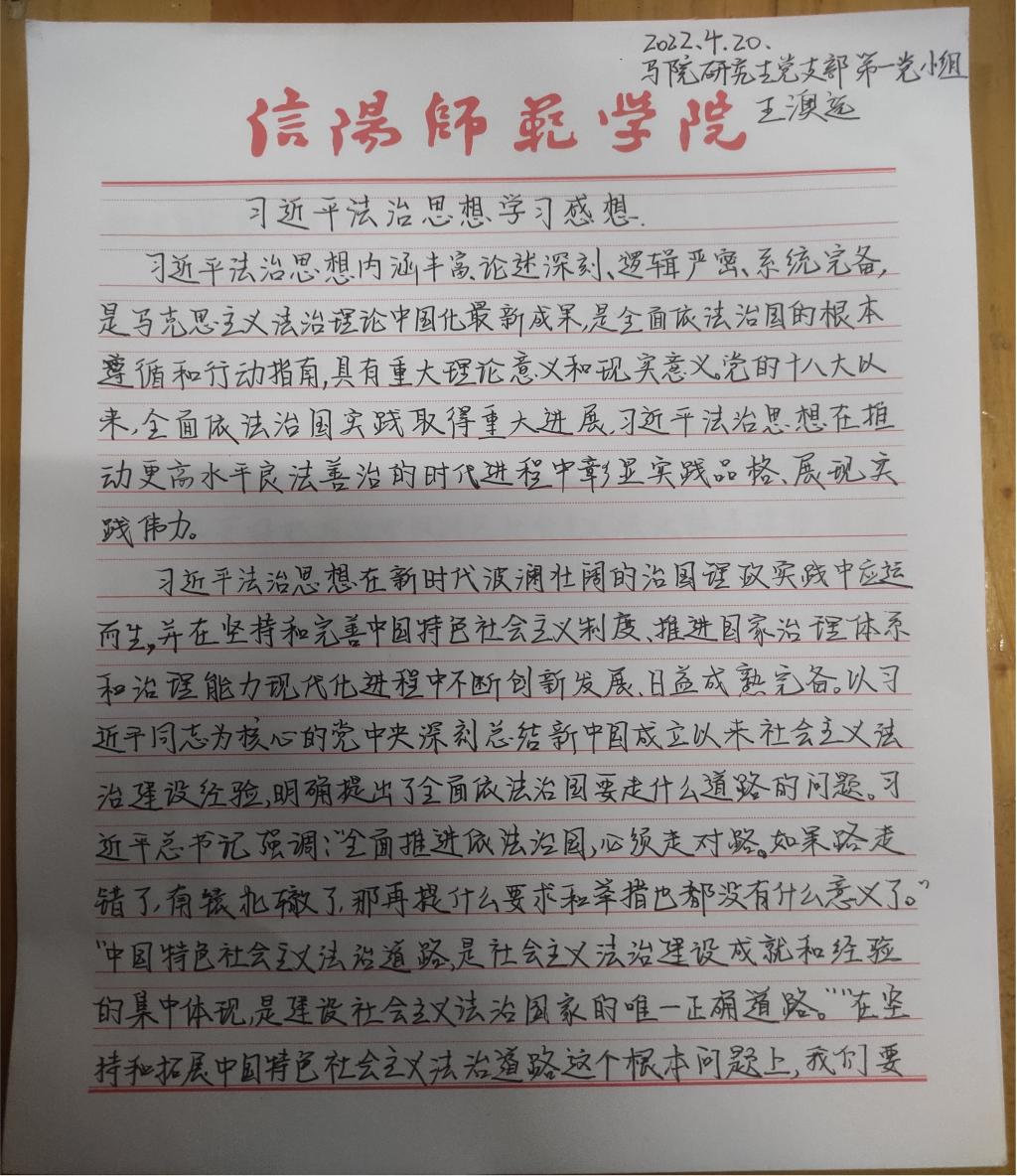 为深入学习贯彻习近平法治思想,增强beat365研究生党员的政治素养和法治意识,beat365研究生党支部开展了习近平法治思想学习交流主题党日活动。beat365研究生党员、预备党员及发展对象积极参与,充分运用互联网等多渠道展开学习,通过观看相关法治宣传片、系统学习习近平法治思想,进一步增强法治意识和思想觉悟。大家根据学习情况,结合自身实际,认真撰写学习习近平法治思想的心得感悟,以下为部分同志撰写的心得感悟图片。