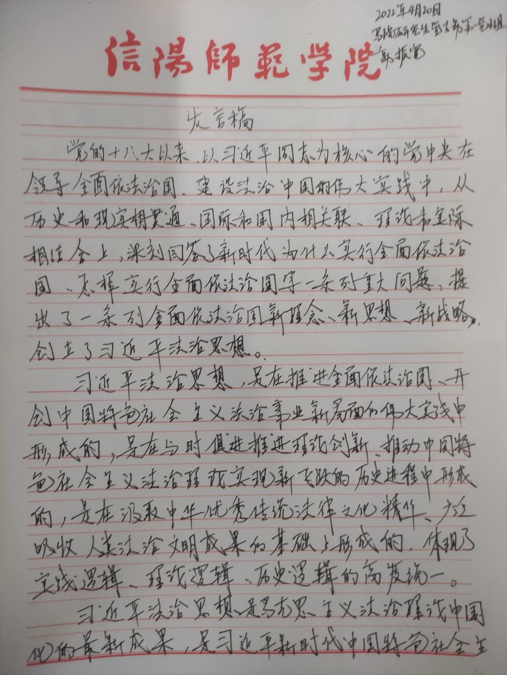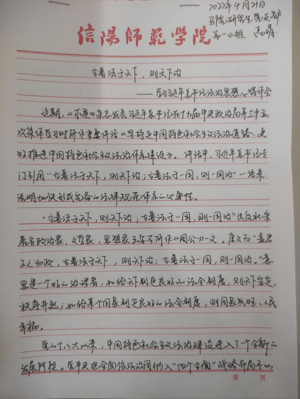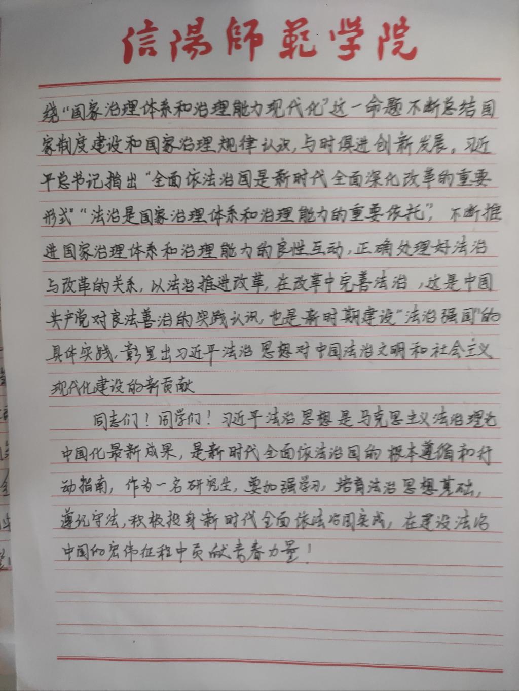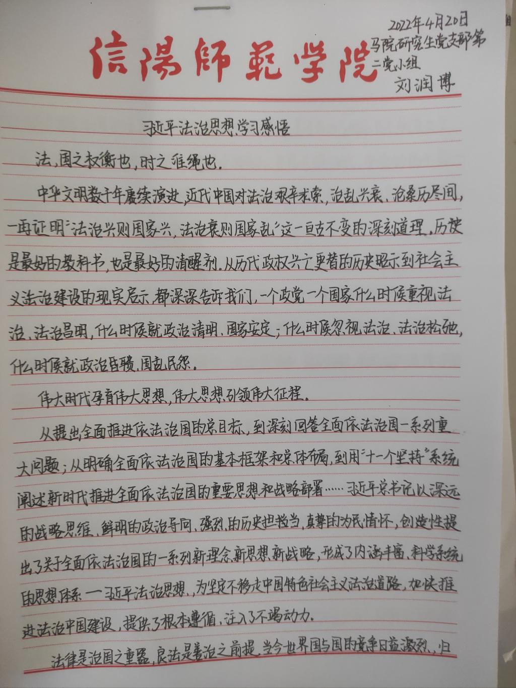为深入学习贯彻习近平法治思想,增强beat365研究生党员的政治素养和法治意识,beat365研究生党支部开展了习近平法治思想学习交流主题党日活动。beat365研究生党员、预备党员及发展对象积极参与,充分运用互联网等多渠道展开学习,通过观看相关法治宣传片、系统学习习近平法治思想,进一步增强法治意识和思想觉悟。大家根据学习情况,结合自身实际,认真撰写学习习近平法治思想的心得感悟,以下为部分同志撰写的心得感悟图片。
