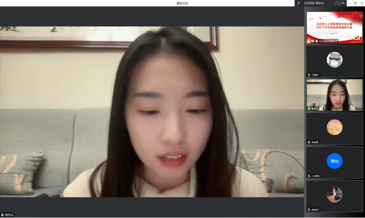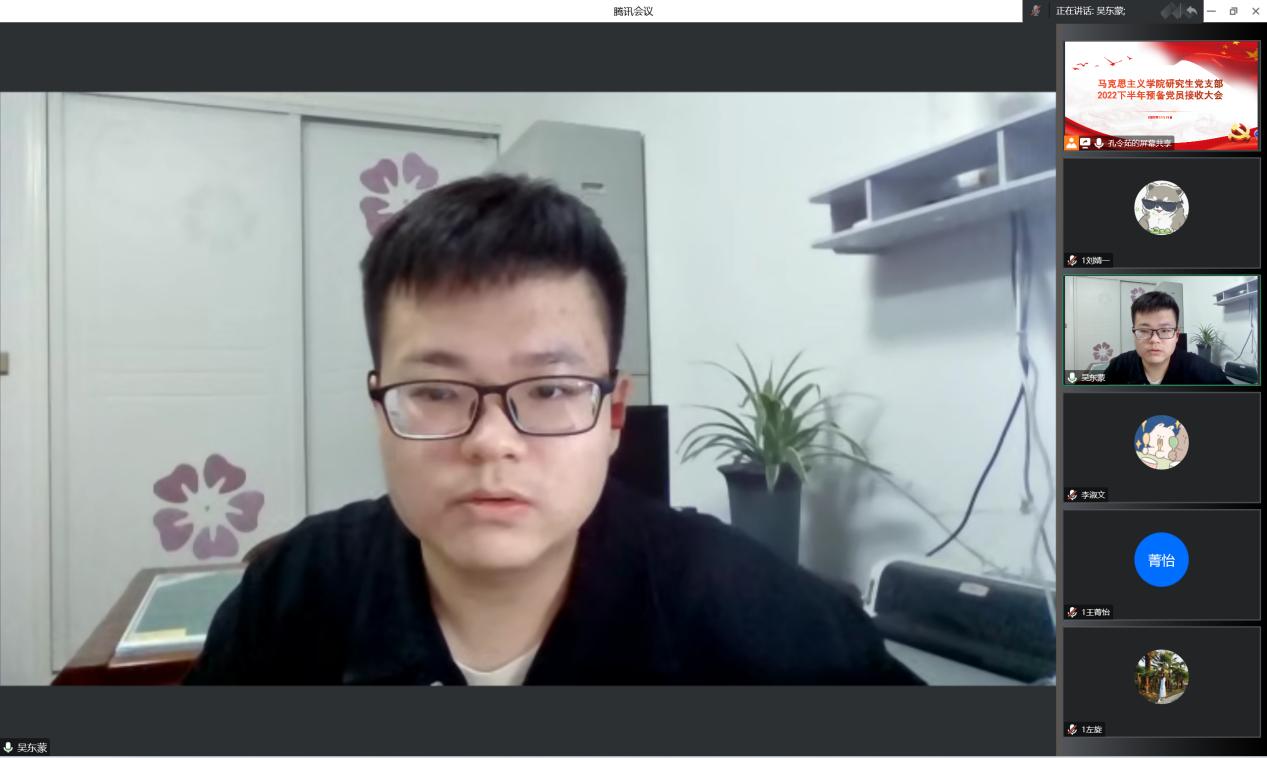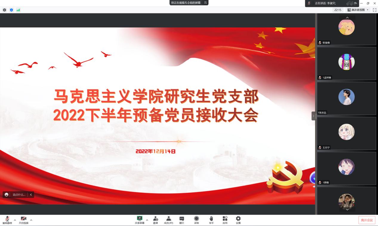 12月14日下午,beat365研究生党支部于线上召开2022下半年预备党员接收大会,讨论了李淑文、吴东蒙、段依梦、张雪倩、黄非凡、王月宁、毛伟威七位同志转为中共预备党员的问题。本次会议由组织委员孔令茹主持,监票人由宣传委员刘婧一担任,计票人由小组长张晓勤担任。