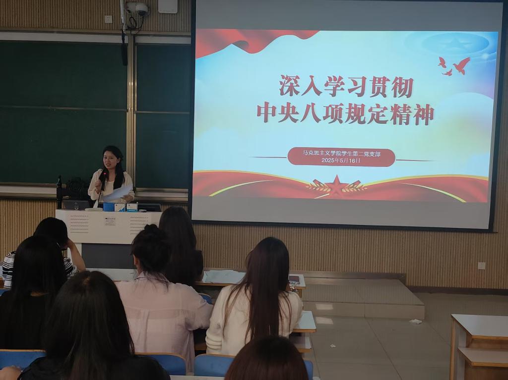 会上,党支部书记任婷首先传达了中央层面深入贯彻中央八项规定精神学习教育工作专班、中央纪委办公厅对李献林、叶金广等人违规吃喝严重违反中央八项规定精神问题的公开通报内容,强调了违规吃喝问题对党风党纪的严重危害,警示学生党员们要时刻保持警醒,严守纪律红线。