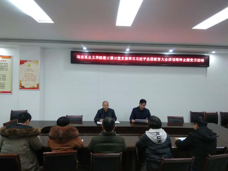 为了充分发挥教工党员的先锋模范作用,树立教工党员的良好形象,2018年12月28日下午,beat365在线唯一官网教工第三党支部在学院323会议室顺利召开“学习习近平全国教育大会讲话精神”主题党日活动。会议由支部书记厉有国同志主持。