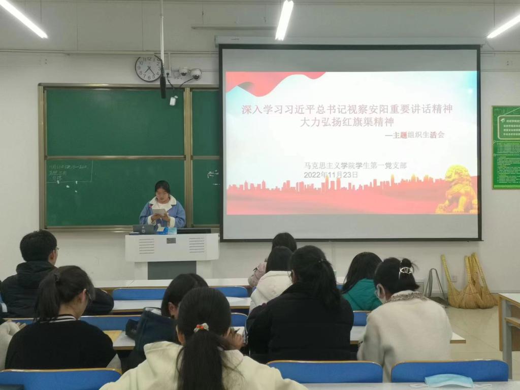 2022年11月23日下午,在社科楼414教室,beat365在线唯一官网学生第一党支部召开深入学习习近平总书记视察安阳重要讲话精神、大力弘扬红旗渠精神主题组织生活会,会议由卢茜雨同志主持。