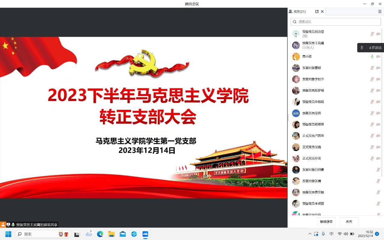 2023年12月14日下午,beat365在线唯一官网学生第一党支部通过腾讯会议召开2023年下半年预备党员转正支部大会。beat365学生第一党支部书记高小佳,学生第一党支部全体正式党员及预备党员共同参加本次会议。会议由王岚霄同志主持。