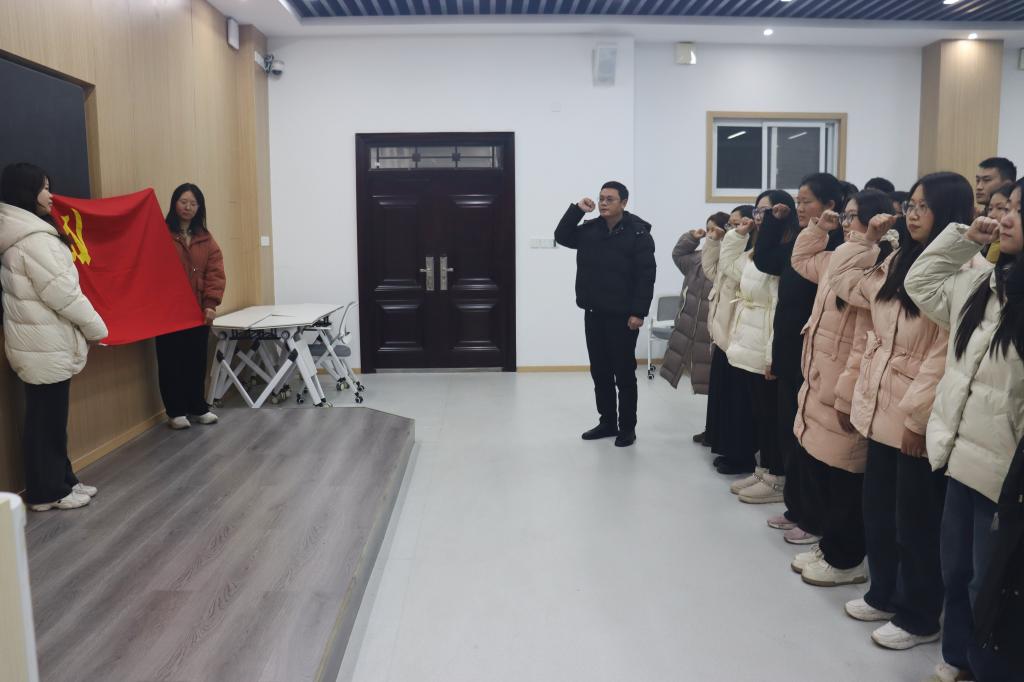 宣誓仪式在庄严的《国际歌》中拉开序幕。随后,任婷宣布参加此次宣誓仪式的预备党员名单。接着,在领誓人黄煌的带领下,他们面向党旗,举起右拳,庄严宣誓。铮铮誓言,拳拳红心,他们用铿锵有力的话语向党组织作出庄严的承诺,字字箴言是预备党员政治生命开始的象征,是怀揣初心站在新起点的他们对党的庄严承诺。宣誓结束后,正式党员代表杨璐、预备党员代表王岚霄、入党积极分子代表李佳茹依次发言,他们表示,将会全面提升自己的思想政治修养,严格要求自己,用实际行动践行入党誓言。最后,黄书记作总结讲话,对全体预备党员及全体党员提出三点要求,一是要提高思想觉悟,加强理论武装,特别是加强对党的历史的学习;二是要坚持理论与实践相结合,将理论运用到实践中去;三是要牢记初心使命,强化责任担当,做有理想有本领有担当的青年。