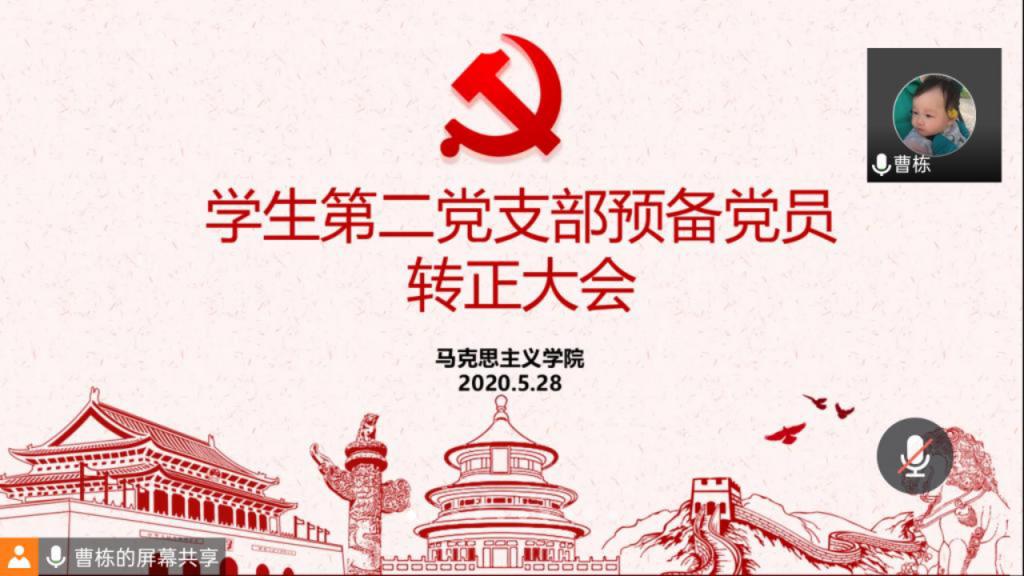 5月28日上午11:00,beat365在线唯一官网学生第二党支部在网上顺利召开了预备党员转正大会,大会讨论关于张雅琼等4名预备党员申请转为正式党员的事宜。学生第二党支部支部书记曹栋、入党介绍人陶青青、杨胜利、全体党员和预备党员共28人参加了此次会议。会议由曹栋主持。