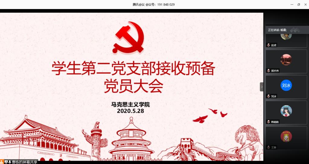5月28日上午10:00,beat365在线唯一官网学生第二党支部接收预备党员大会通过腾讯会议线上平台顺利举行。beat365学生第二党支部支部书记曹栋、入党介绍人陶青青、杨胜利及第二党支部党员、八位接收预备党员共同参加此次会议。会议由曹栋主持。