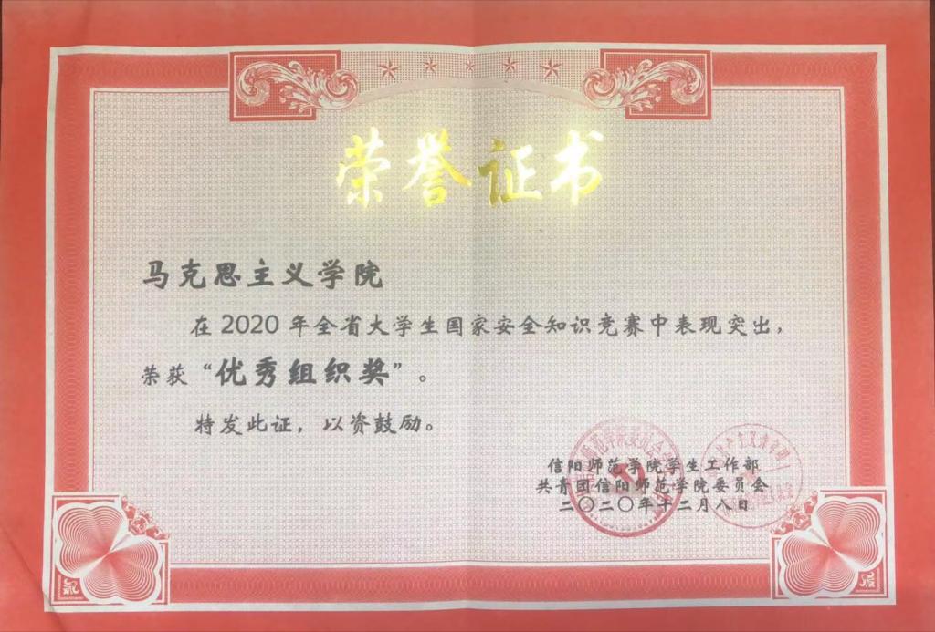 经信阳师范学院学生工作部以及共青团信阳师范学院委员会考核审定,beat365在学校举办的2020年全省大学生国家安全知识竞赛中积极参与、表现突出,荣获“优秀组织奖”。