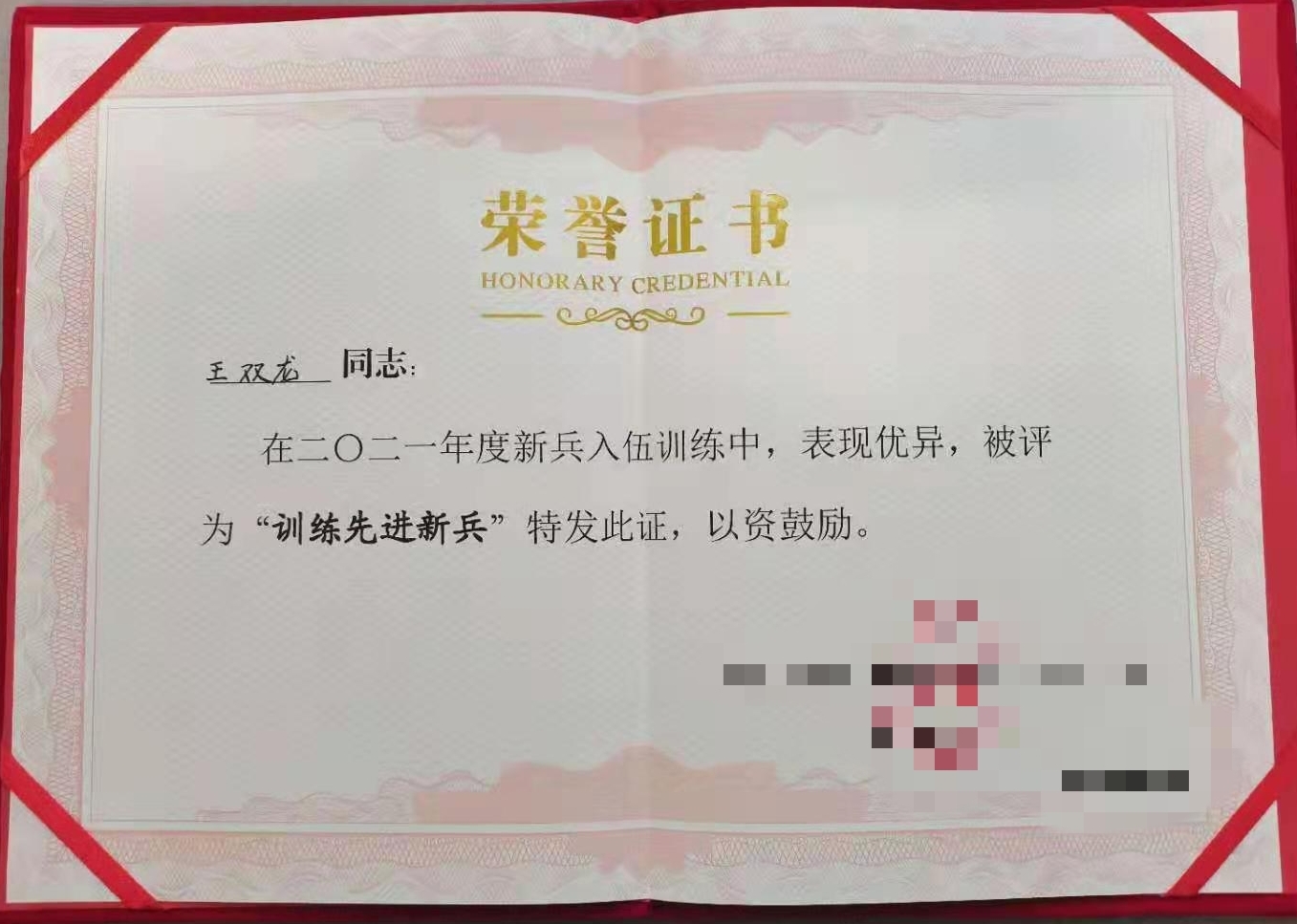 王双龙是beat3652020级思想政治教育专业一班学生,2021年应征入伍,目前服役于陆军某部队。入伍以后,王双龙在训练场上勇往直前,淬炼成钢,各方面表现积极,对于工作和任务认真负责,用实际行动唱响自己的军营梦。通过不断努力,王双龙凭借优异表现荣获2021年度“训练先进新兵”称号,受到陆军某部队领导一致好评。