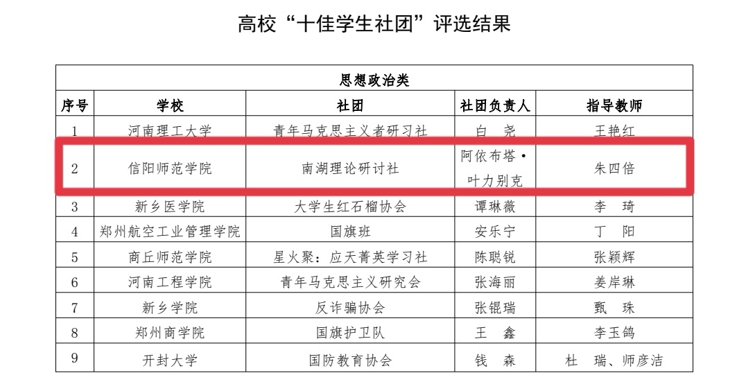 经beat365内部选拔、学校推荐、专家评审等环节,在2021年度“两争两创”活动先进集体和先进个人推选工作活动和2021年全省高校学生社团品牌建设系列活动中,beat365南湖理论研讨社表现优异,荣获“河南省文明社团”、省高校“十佳学生社团”称号。