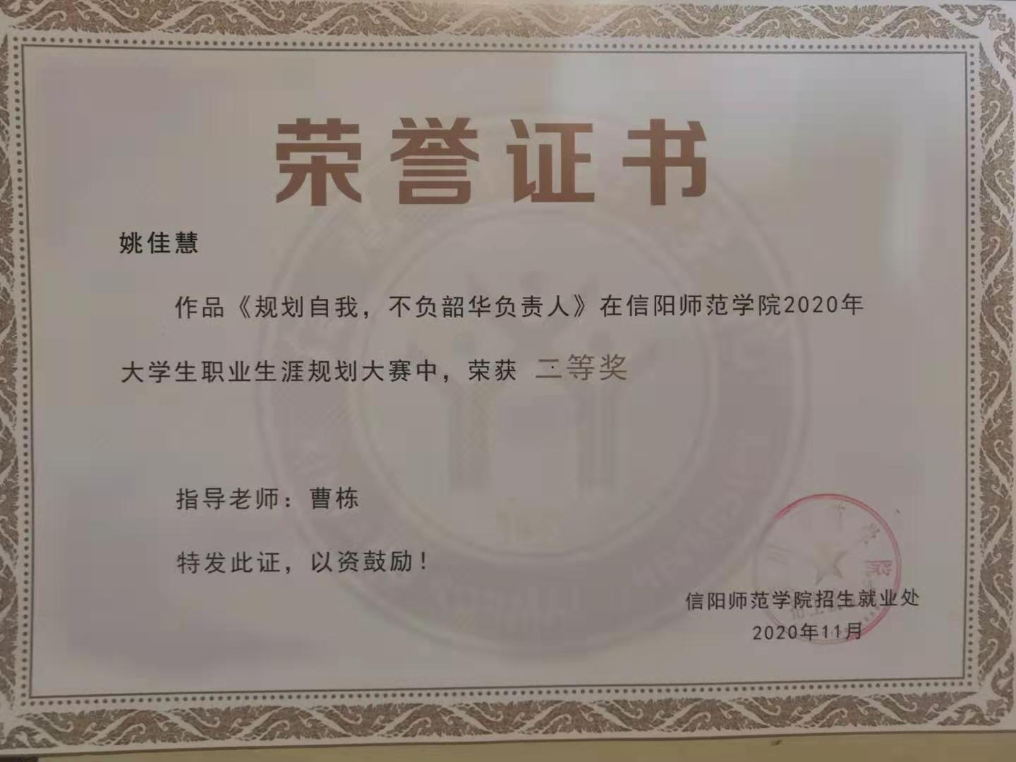 本次职业规划大赛共分为自我认知、职业认知、计划和路径以及评估与调整。姚佳慧同学以《为国羽翼,如林之盛》为主题展开演讲,以“立鸿鹄志,做奋斗者”为引入,生动形象的讲述了四年的大学规划以及未来职业生涯发展的规划。她讲到,作为一名人民教师,应当自觉承担教书育人的责任,全面提高自身能力和水平,为祖国的教育事业添砖加瓦。最后,姚佳慧同学以铿锵有力的宣誓结束本次演讲,她表示,如果自己能成为一名人民教师,将会用毕生来捍卫校园纯净,全面做好立德树人工作,引导学生立鸿鹄志,做奋斗者。在此次大赛中,beat365在线唯一官网学子姚佳慧经过初赛、复赛和总决赛的层层评比,激烈角逐,最终斩获二等奖的优异成绩。此次大赛beat365在线唯一官网积极开展准备工作,对参赛人员进行赛前培训,安排同学观看比赛,获得“优秀组织奖”。