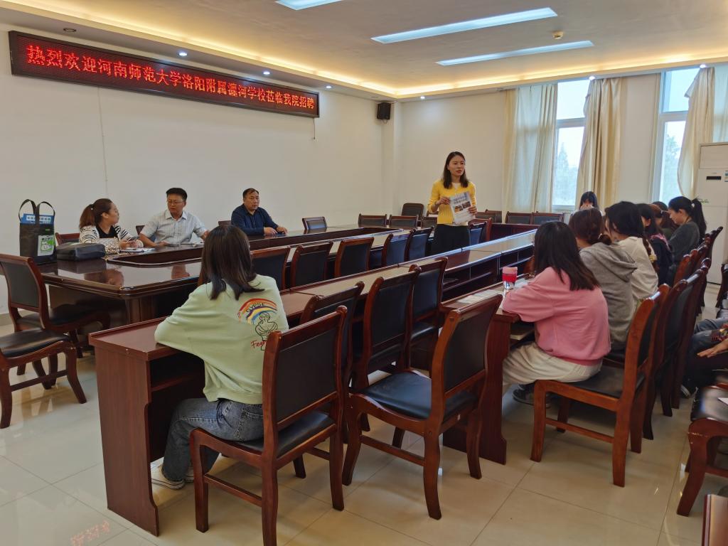 5月12日上午,河南师范大学附属洛阳瀍河学校莅临beat365招聘,招聘会在社科楼323会议室顺利召开。河南师范大学附属洛阳瀍河学校各位招聘老师代表、就业秘书陶青青、辅导员曹菁菁以及beat3652018级学生代表共同参加本次招聘会。