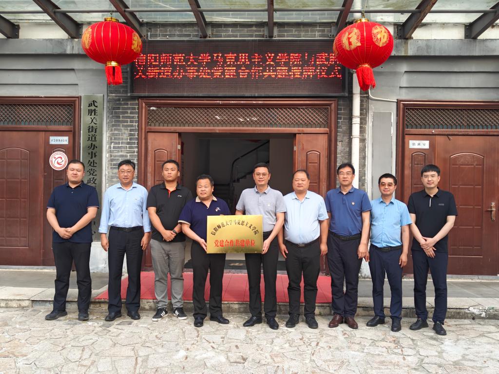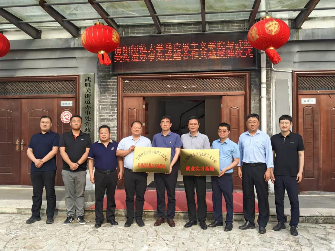 双方相关负责人在党建合作、学生就业服务、科学研究、成果转化、实习实训基地共建等方面进一步交流,达成相关合作意向,并向武胜关街道办事处授予beat365在线唯一官网党建合作共建单位、思想政治教育实践基地、信阳师范大学“就业实习基地”牌匾。