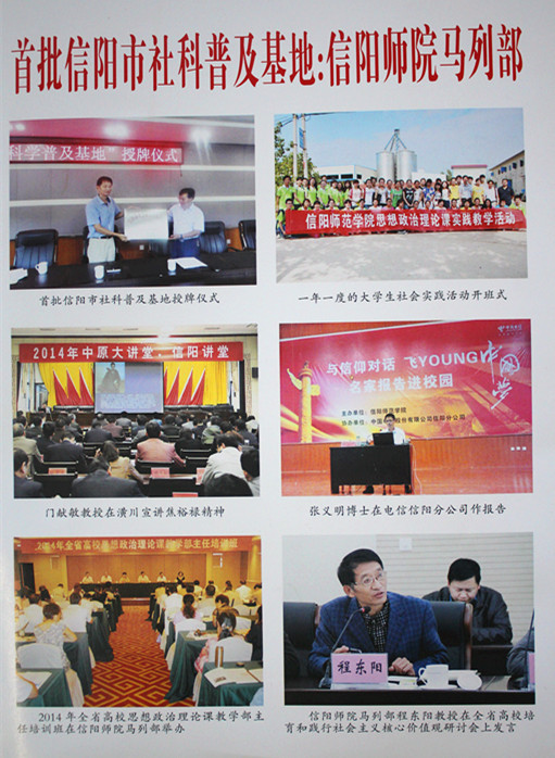 信阳师范学院是河南省两所重点本科师范院校之一、中央文明委授予的“全国文明单位”、被全国人大常委会原副委员长、著名社会活动家、教育家费孝通先生誉为“教师之摇篮”。信阳师范学院马列主义教研部(简称马列部)是直属于校本部领导的正处级单位,现有5个教研室和一个办公室,现有教师22人,其中教授3人,副教授8人,讲师11人;硕士研究生10人,博士研究生3人;硕士生导师5人。承担着全校2万余名本专科学生和研究生的思想政治理论课教学与科研任务。经过30多年的积累与发展,马克思主义理论的教学和科学研究等各项工作都取得了突出成绩,已成长为在全省高校颇具影响力的思想政治理论课教学研究部,被中共信阳市委宣传部和信阳市社科联授予“首批信阳市社会科学普及基地”称号。