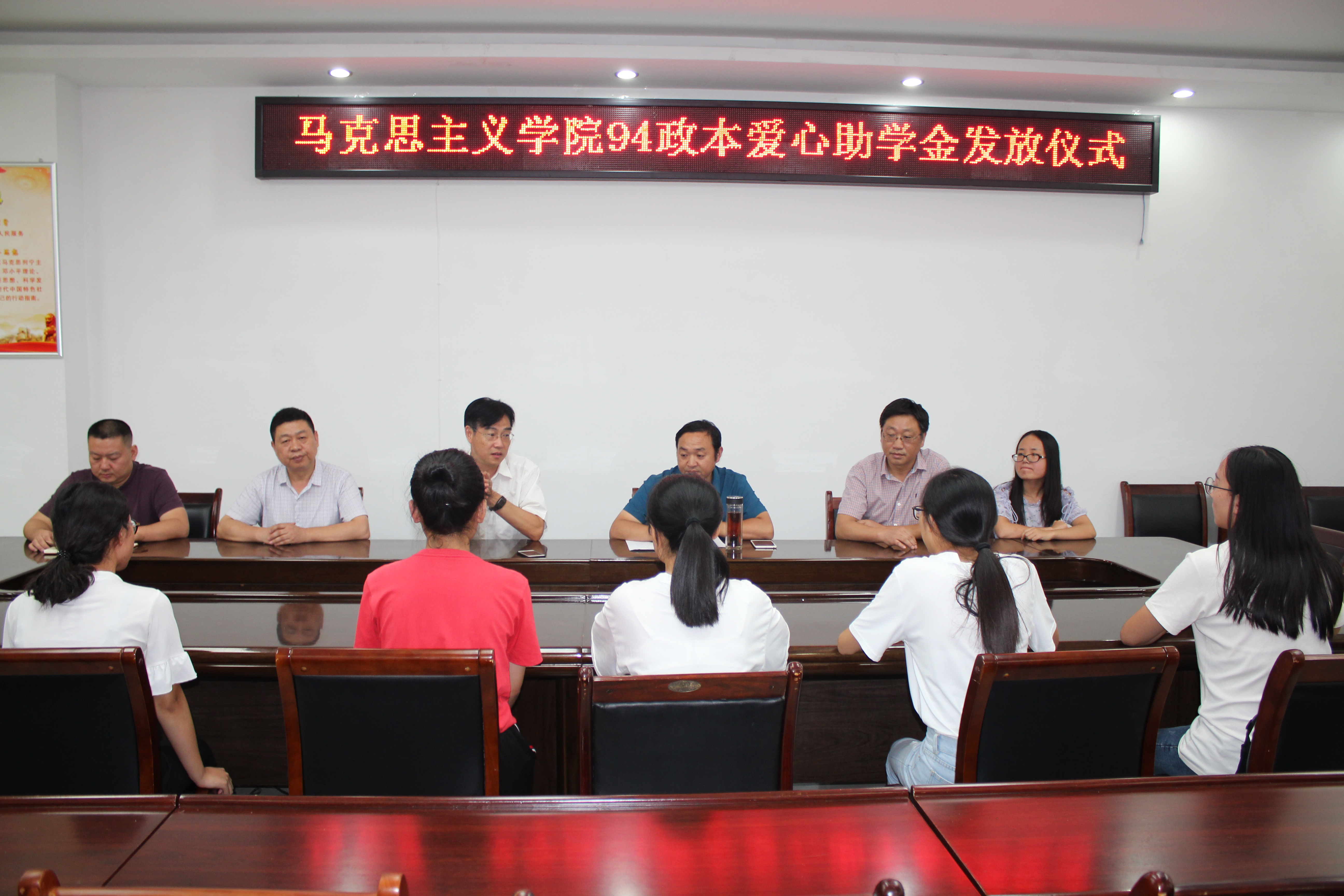 9月7日下午,beat365在线唯一官网于社科楼323会议室举行94政本首批爱心助学金发放仪式。94政本校友代表中共信阳市委党校科研处副处长王瑞,学院副院长周智、程晋富,当代马克思主义研究所副所长门献敏,党委副书记何晓坚,团委老师曹菁菁及首批资助对象六位同学共同参与了本次仪式。仪式由周智主持。
