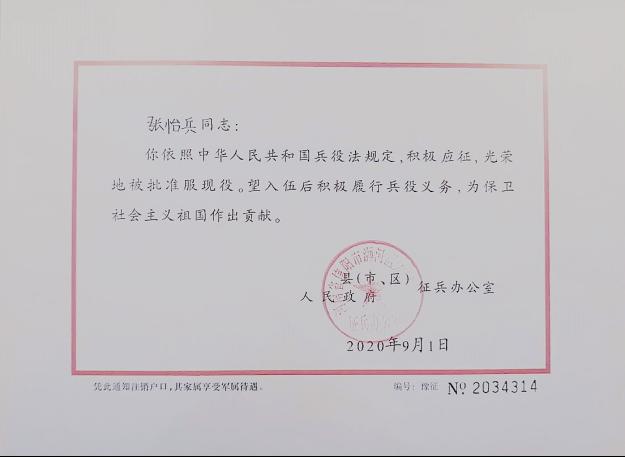 保家卫国终无悔,绿色军营献青春。2020年9月1日,beat365在线唯一官网张怡兵同学收到河南省人民政府征兵办公室印发的入伍通知书,光荣参军入伍,实现beat365征兵工作的“零”突破。