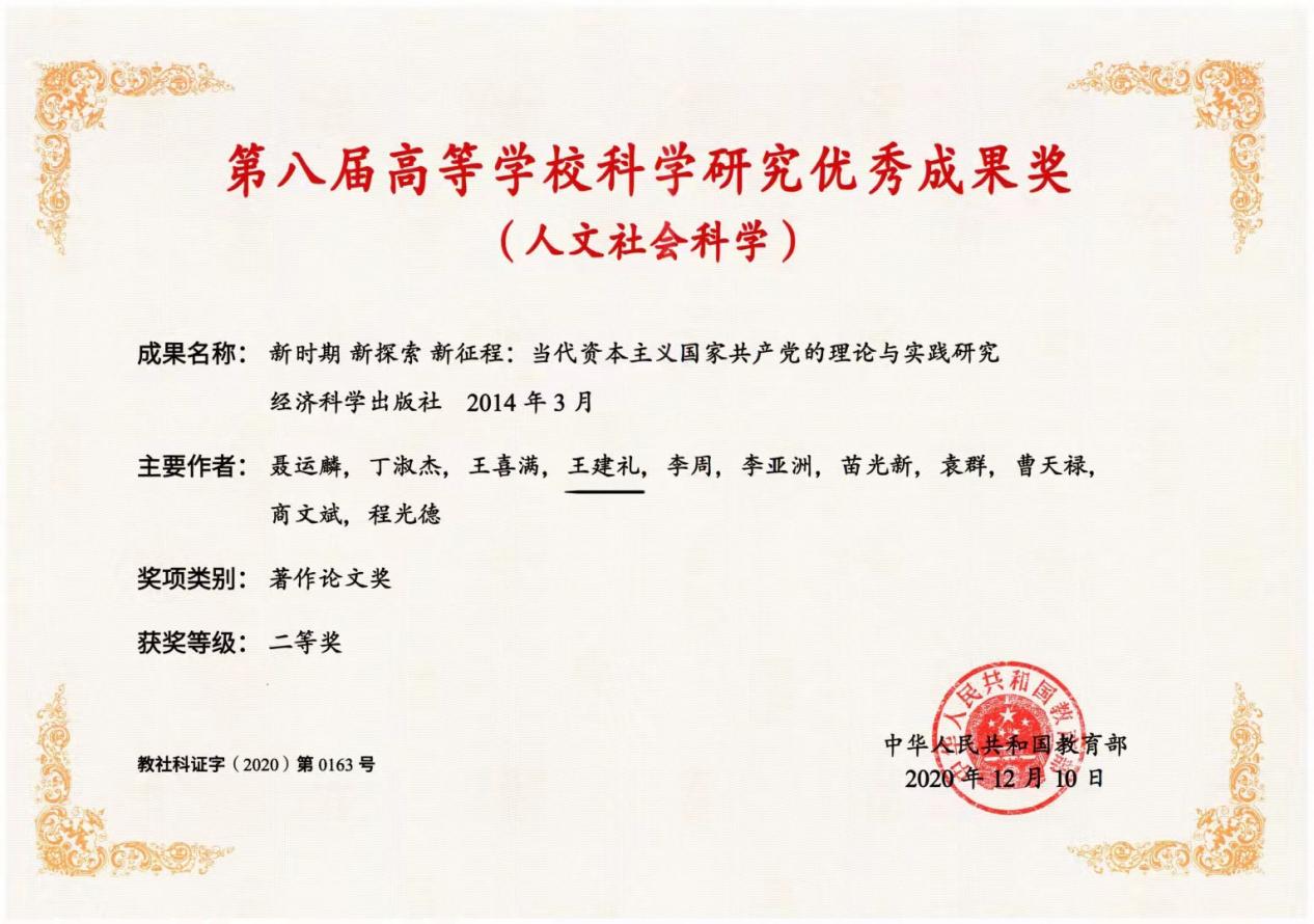 在教育部第八届高等学校科学研究优秀成果奖(人文社会科学)评选中,华中师范大学聂运麟教授等著、beat365王建礼博士参与的著作《新时期新探索新征程:当代资本主义国家共产党的理论与实践研究》(经济科学出版社2014年版)荣获“著作论文奖类二等奖”。