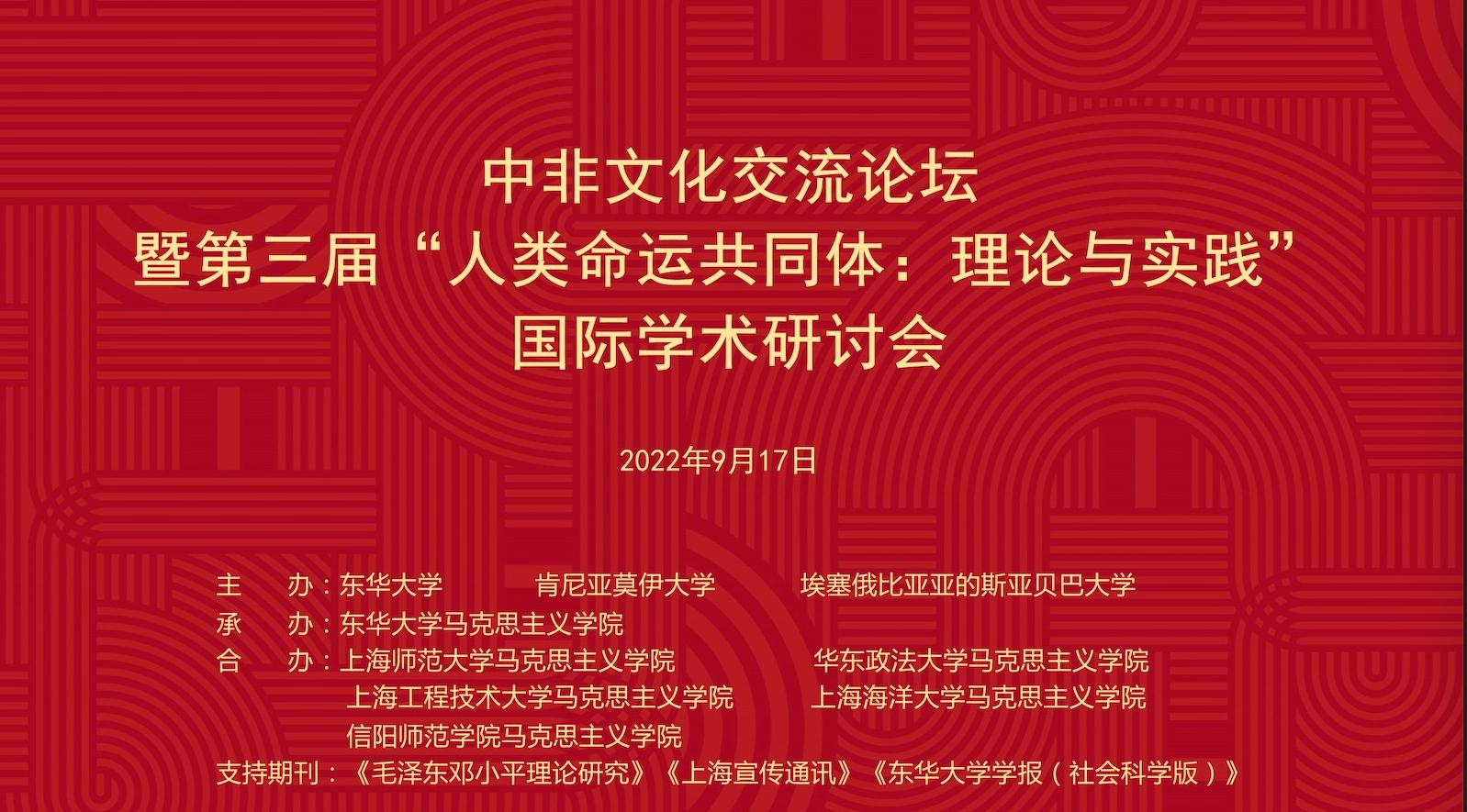由我校beat365在线唯一官网与东华大学beat365在线唯一官网等单位共同举办的2022中非文化交流论坛暨第三届“人类命运共同体:理论与实践”国际学术研讨会于9月17日在线上成功举行。来自澳门城市大学、上海师范大学、华东政法大学、上海技术大学、信阳师范学院等高校和科研机构的专家学者,分别围绕各自的主题,在论坛上进行了分享交流。本次研讨会旨在通过搭建高水平的学术对话平台,汇聚海内外学者及各界人士共同探讨人类命运共同体的文明底色和发展前景,为构建人类命运共同体注入思想力量。