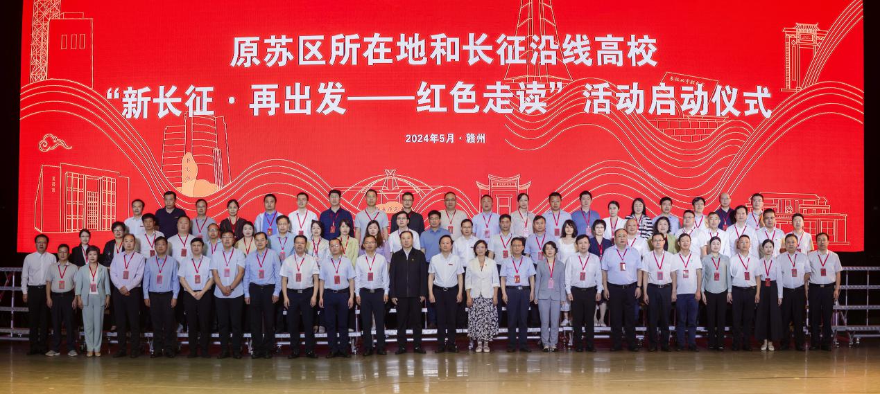 在中央红军长征出发90周年、习近平总书记考察赣南老区5周年之际,5月20日,由赣南师范大学、延安大学、海南师范大学、湖北师范大学、信阳师范大学、江西理工大学等17所高校联合发起的原苏区所在地和长征沿线高校“新长征·再出发——红色走读”活动启动仪式在赣南师范大学举行。原苏区所在地和长征沿线高校分管校领导、党委宣传部、学工部、beat365在线唯一官网负责同志,瑞金中央革命根据地纪念馆、于都中央红军长征集结出发地等历史博物馆负责同志共计1000余人参加仪式。仪式由赣南师范大学党委副书记刘民主持。我校beat365在线唯一官网院长唐国战、《中国近现代史纲要》教研室主任陈杰、分团委书记陶青青受邀参加本次活动。