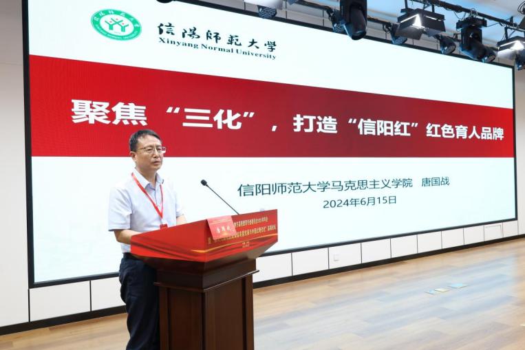 在专家报告中,院长唐国战以《聚焦“三化”,打造“信阳红”红色育人品牌》为题做了专题发言。唐国战提到大别山区军民创造了“28年红旗不倒”的革命奇迹,铸就了“坚守信念、胸怀全局、团结一心、勇当前锋”的大别山精神,形成了具有独特区域教育特质的“信阳红”精神标识。近年来,beat365在线唯一官网扎根大别山革命老区,深入挖掘大别山红色资源,汇聚提炼丰富育人元素,将信阳“红”的属性融入思政课程、课程思政、大中小学思政课一体化建设等诸多方面,构建红色育人体系,打造红色育人高地,培育红色时代新人,取得了显著成效。