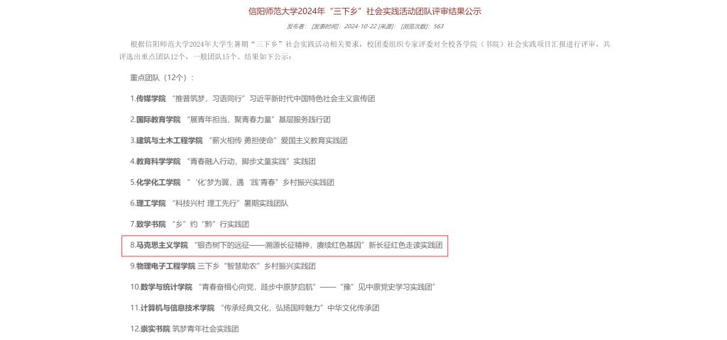 近日,信阳师范大学2024年“三下乡”社会实践活动团队评审结果公示。此次评选依据相关要求,由校团委组织专家对全校各学院(书院)社会实践项目汇报进行评审,beat365在线唯一官网“溯源长征精神,赓续红色基因”新长征红色走读实践团评选为重点团队。