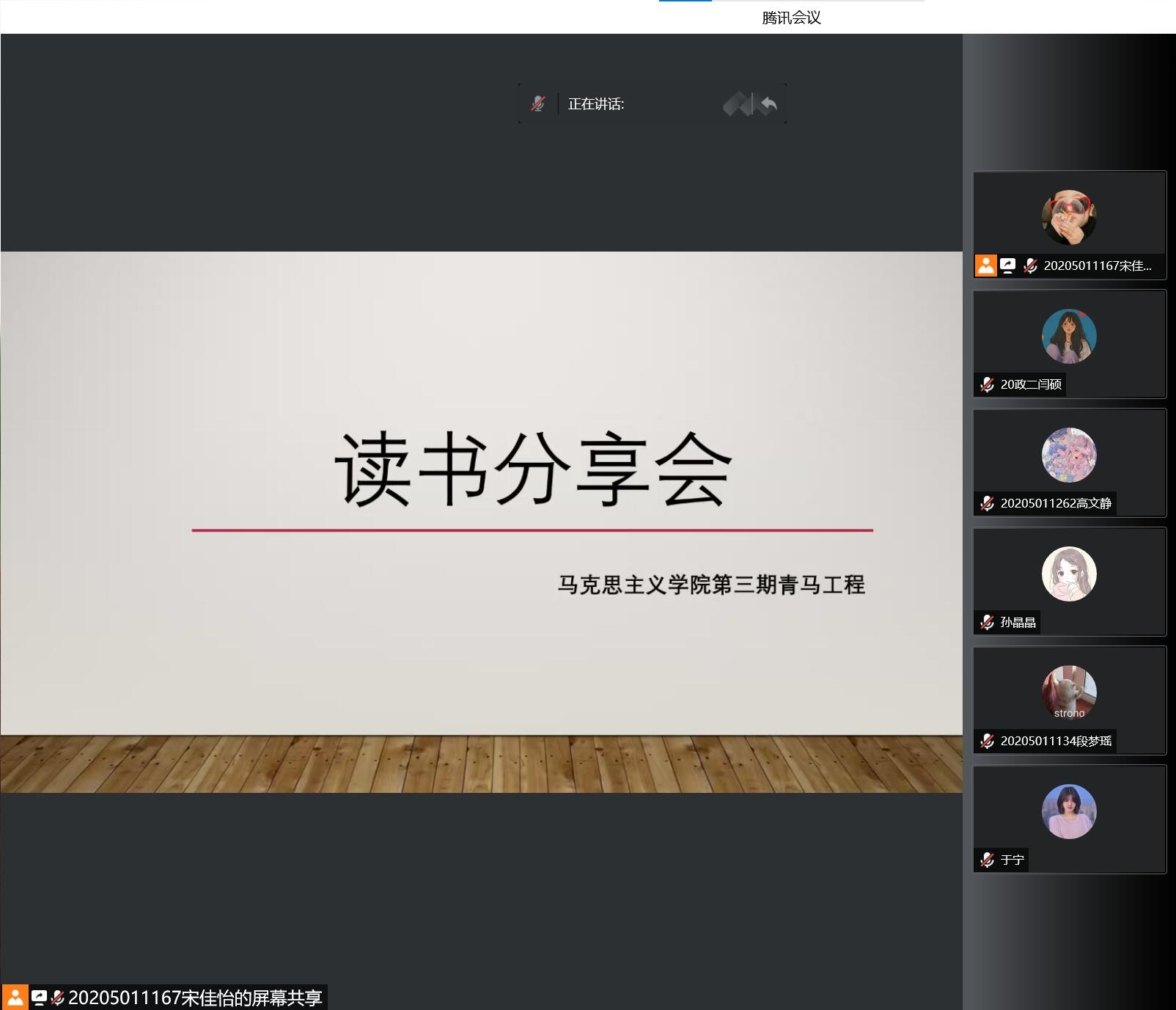 4月30日晚,beat365在线唯一官网第三期优秀“青马”工程学员们通过腾讯会议开展了读书分享会活动。活动由班长宋佳怡主持。