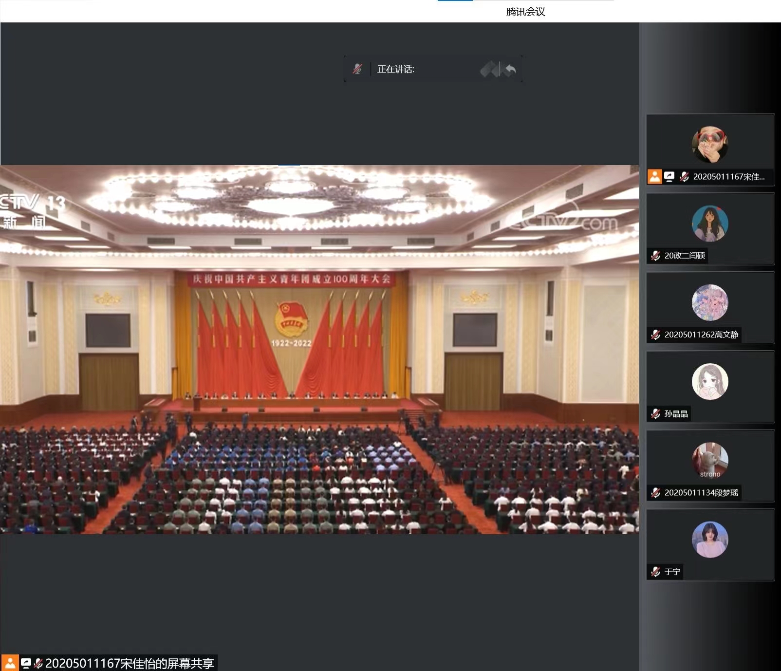 5月14日晚,beat365在线唯一官网第三期优秀“青马”工程学员们通过腾讯会议共同观看习近平总书记在庆祝中国共青团成立100周年大会上的讲话。活动由班长宋佳怡主持。