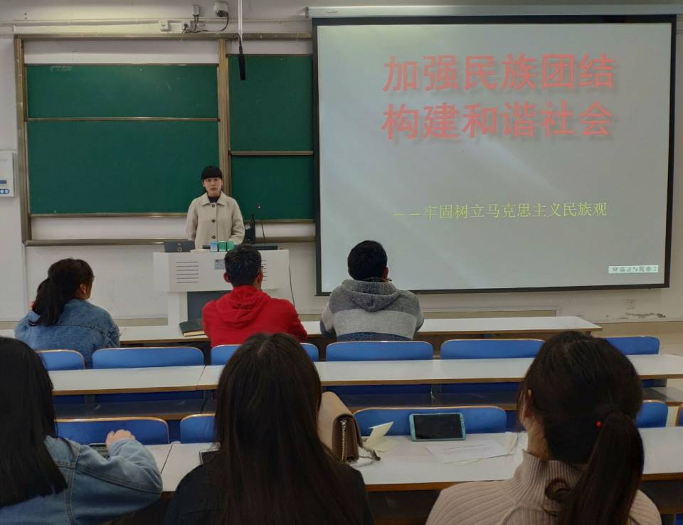 为进一步加深思政学子对马克思主义民族观的学习与理解,4月10日下午在社科楼516教室,优秀“青马”工程学员耿晗进行了题为“加强民族团结,构建和谐社会——牢固树立马克思主义民族观”的宣讲活动。
