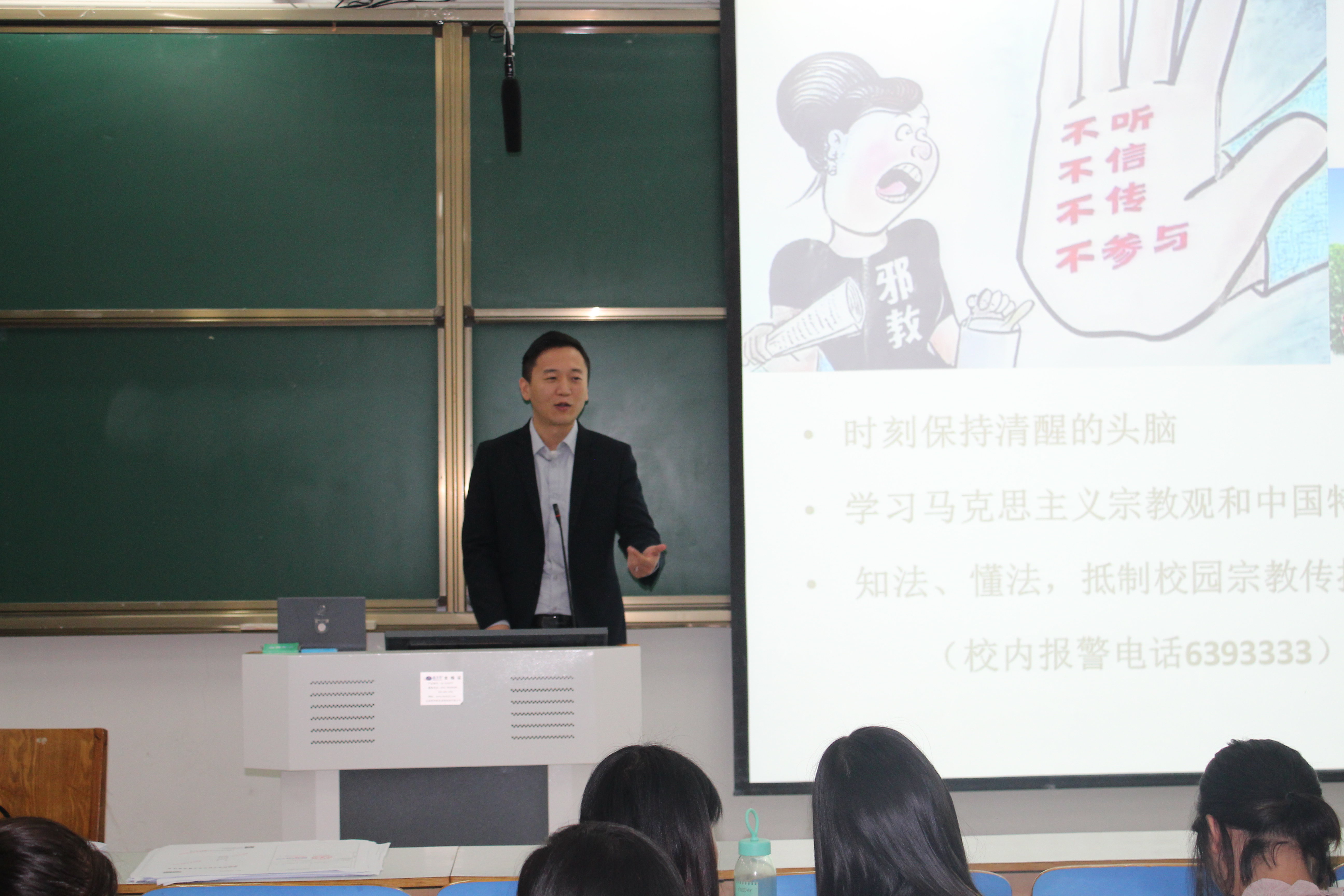 会上,张英就我国宗教政策、邪教危害、如何区分邪教宗教三方面展开叙述。同时,她提出三点要求。一是,我国实行政教分离原则,宗教不能干涉国家教育制度。作为思政学子,我们要用科学思想武装自己,坚持无神论,防止宗教渗透。第二,作为一名合格大学生,要认清邪教,杜绝加入邪教组织,维护自身安全。第三,我们要从发展历史、活动形式等方面正确区分邪教和宗教,保持清醒头脑,抵制邪教。随后,团支书刘润蕊指明邪教传播手段与途径,警示同学们要正确区分邪教和宗教。最后,曹栋作出总结,他指出,宗教与教育是有严格区分的,教育法明确规定宗教不能渗透到教育中。作为即将实习的大四学生,在实习单位有责任和义务反对宗教渗透。同时,要提高自我保护意识,树立正确思想。
