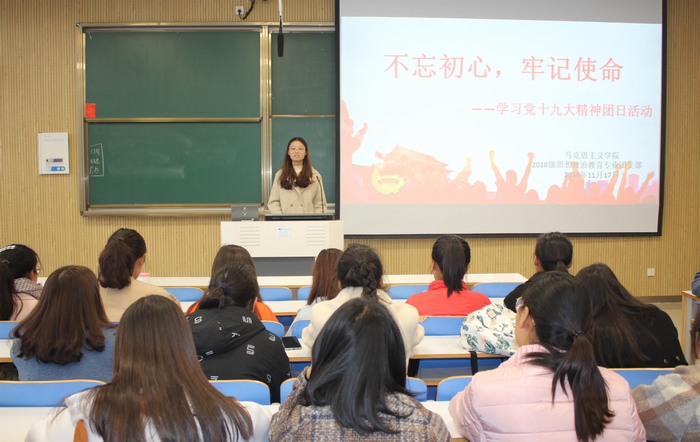 为深刻领悟十九大报告精神,加强学子理论的学习与交流,11月17日下午,beat365在社科楼515教室开展“不忘初心,牢记使命”学习党的十九大精神团日活动。2018级全体同学共同参与此次团课,本次团课由分团委副书记张雅琼主持。