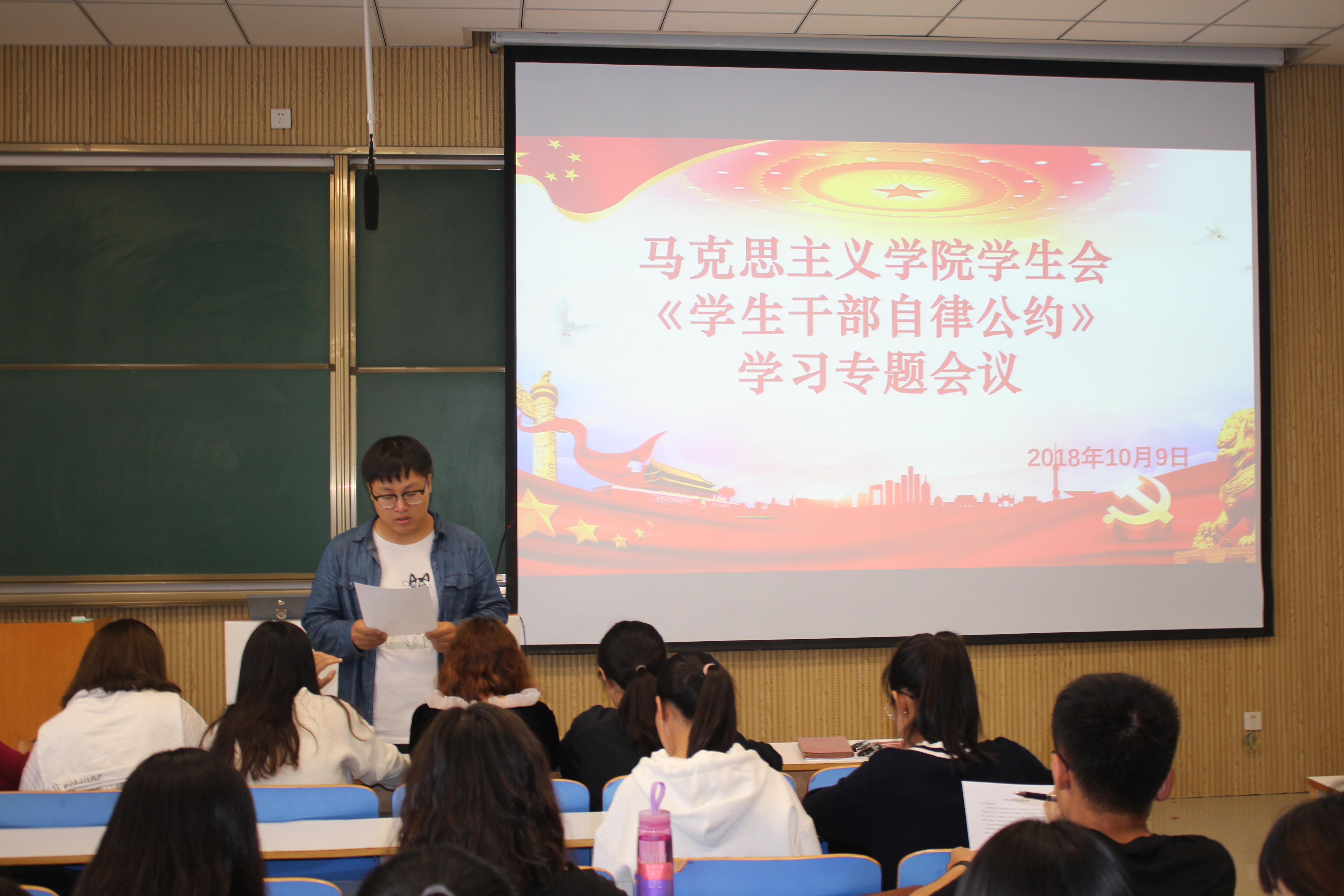 为建设一支胸怀理想、心系同学、品学兼优、作风扎实的学生骨干队伍,10月9日上午,beat365在社科楼515教室举行beat365在线唯一官网《学生干部自律公约》学习专题会议。beat365学生会主席团,学生会各部门、社团及各班级负责人共同参加此次会议。本次会议由学生会主席史弘扬主持。