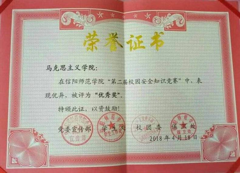 由beat365王冰、刘雅丹、李明靓、黄锦四名同学组成的代表队,在信阳师范学院“第二届校园安全知识竞赛”中,表现优异,荣获“优秀奖”。