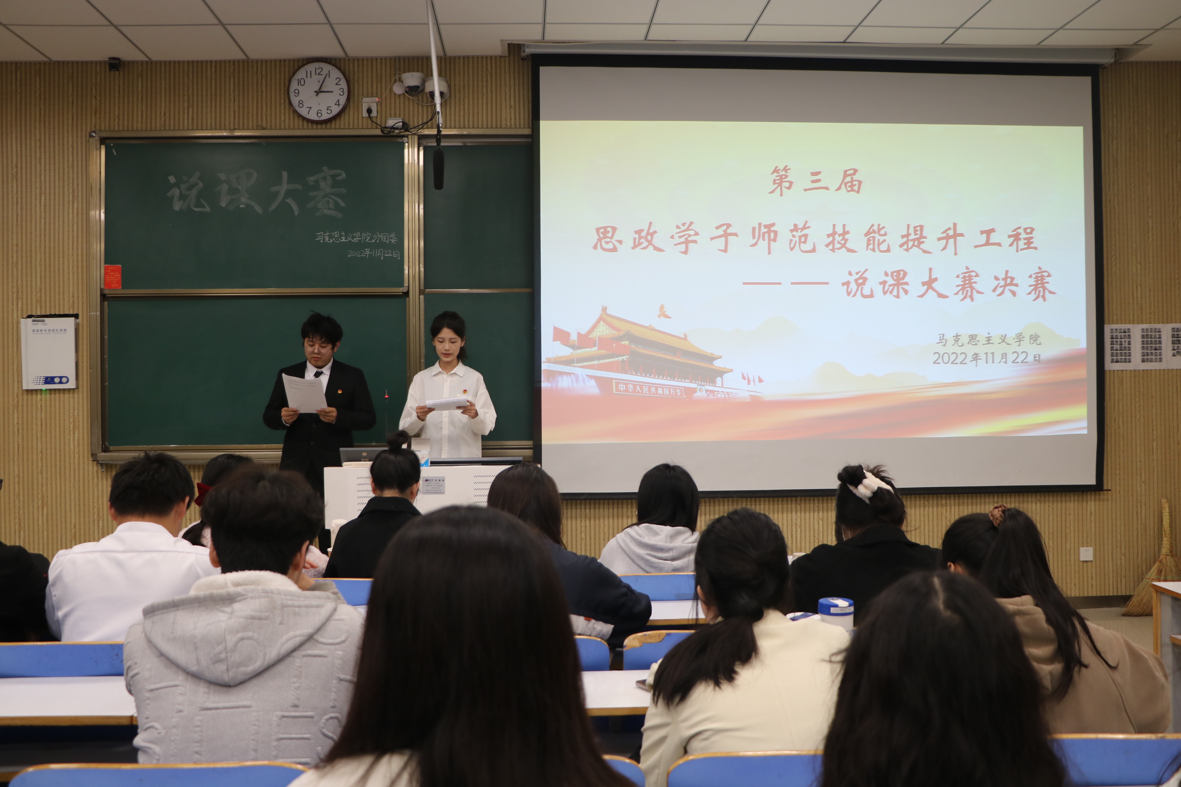 经过初赛的激烈角逐,最终共有10组参赛选手入围决赛。比赛过程中,各参赛选手从教学分析、教学过程、教学设计、教学反思等方面入手,以明确的说课目标、流畅的语言表达,赛出了思政学子的风采和水平。其中,张格格组以“生活难免有挫折”为主题,凭借落落大方的教学姿态、充分自然的眼神互动、清晰流利的语言表达、极具感染力的课堂讲解获得了评委老师的一致好评,最终荣获一等奖。比赛结束后,任婷围绕教师口语、教学设计、授课内容对此次比赛进行总结。她强调,未来想要成为一名出彩的思政教师,一要在教学中重视学生潜力的挖掘和实践的锻炼;二要注重教学研究,增强专业技能;三要锻造人格,不断提高自身素养。