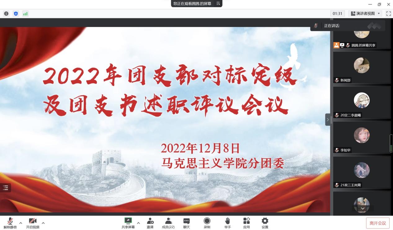 为增进各团支部之间的学习交流,加强beat365在线唯一官网团支部建设,12月8日下午,beat365在线唯一官网在线上召开2022年团支部对标定级及团支书述职评议会议。班主任代表杨春艳及各班团支书共同参与本次会议。会议由分团委副书记张晴主持。