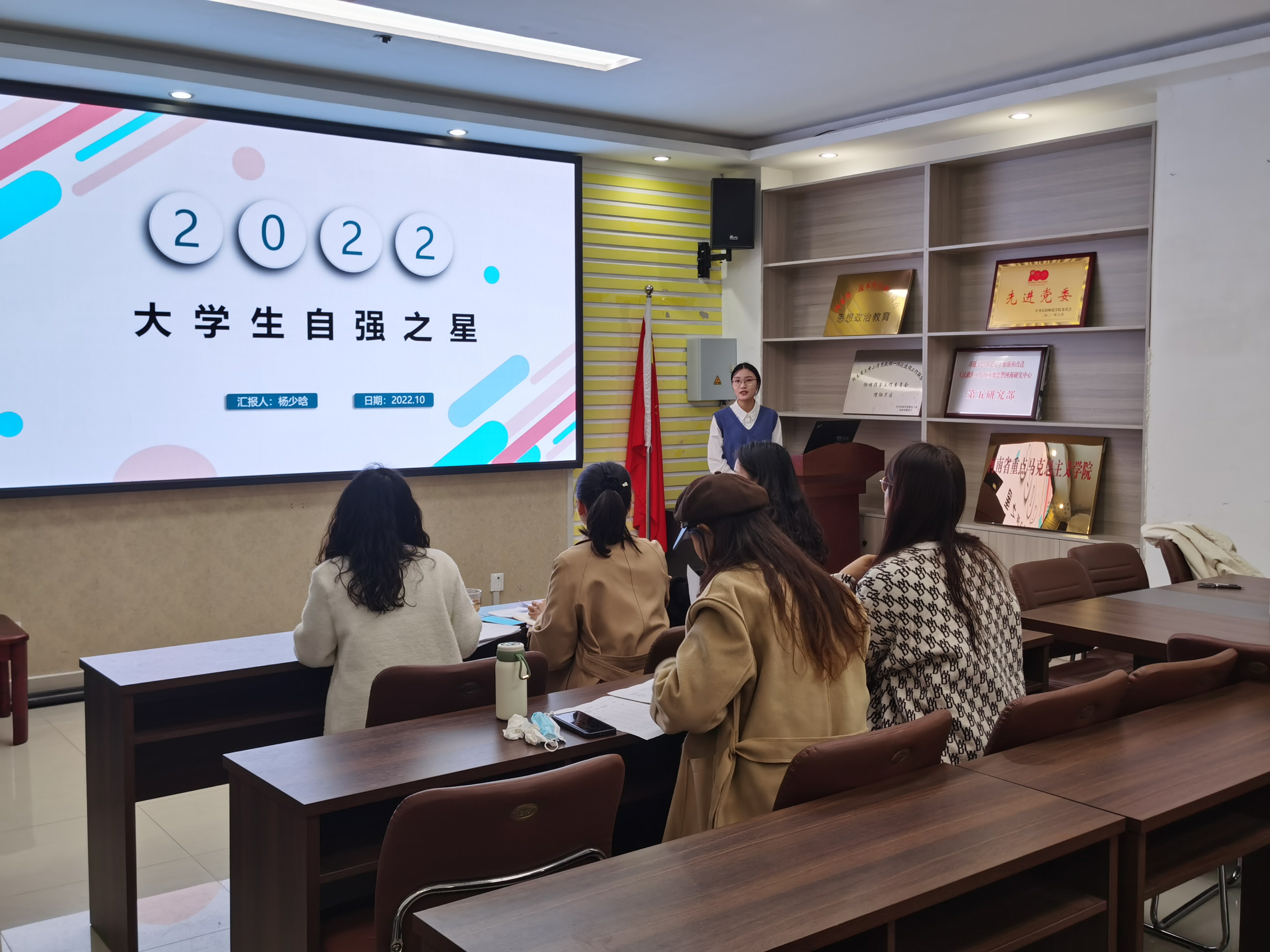 为深入贯彻落实习近平总书记关于青年工作的重要思想,鼓励青年践行“强国有我”的青春宣言,10月26日上午,beat365在线唯一官网在社科楼323会议室举办了“大学生自强之星”候选人评选活动,beat365团委书记陶青青,专职组织员任婷,班主任王明园、杨春艳、吴梦云出席活动并担任评委。活动由组织部负责人韩奕晨主持。