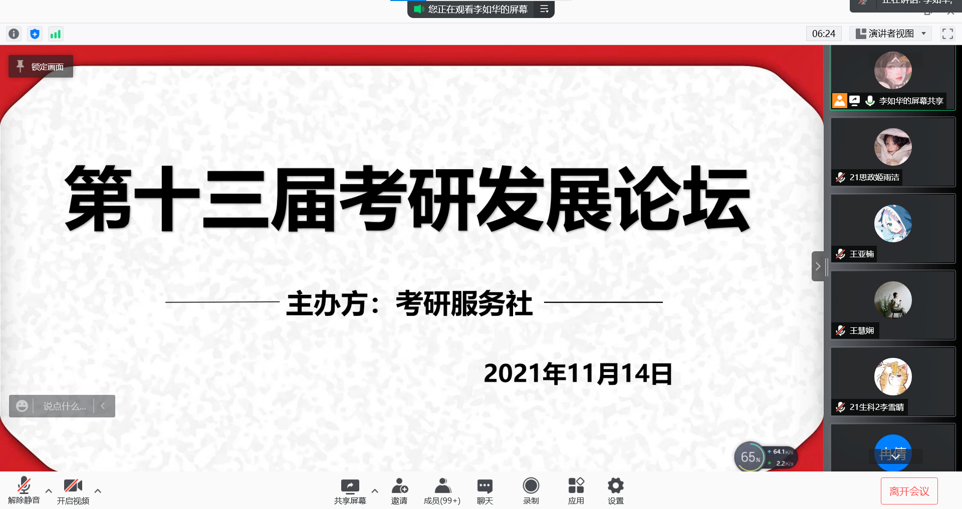 11月14日晚,beat365在线唯一官网考研服务社在腾讯会议举办第十三届考研发展论坛。beat365在线唯一官网党委副书记黄煌、团委书记曹栋、校学生会社团部以及数百名学子通过腾讯会议参加本次论坛,论坛由邵子原、刘程祎主持。