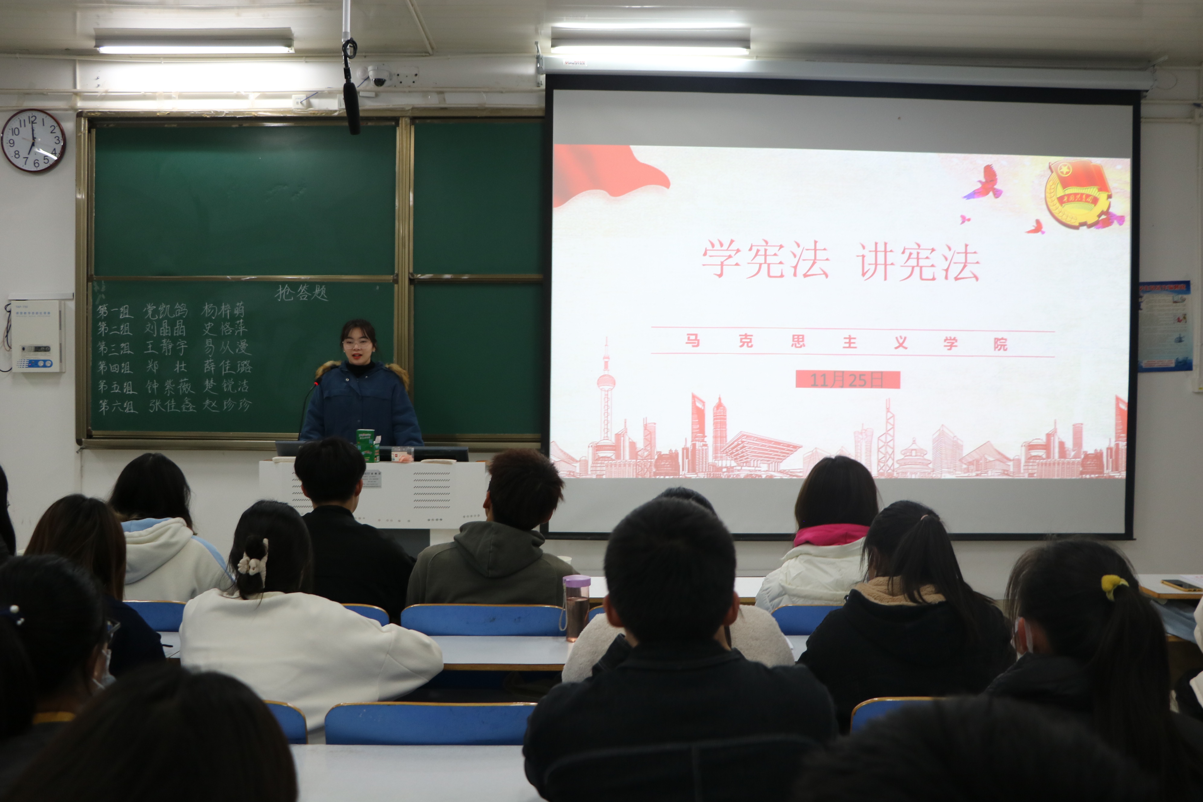 经过初赛的激烈角逐,共有六组选手成功进入决赛。本次竞赛运用线上答题和线下演讲相结合的方式进行,包括现场答题、抢答环节、即兴演讲三个环节,竞赛题目涵盖宪法常识及我国宪法的发展历程、地位作用等方面内容,兼具趣味性与知识性。在抢答环节中,各参赛小组争先抢答,现场竞争激烈。在即兴演讲环节中,各小组代表根据所抽到的题目依次上台进行演讲。其中,第一组代表党凯鸽围绕“精彩成长路,成功伴我行”这一题目讲述了什么是宪法、为什么要遵守宪法以及怎样做一个遵纪守法的好公民,她表示,新时代大学生应做到尊法、学法、守法、用法。第四组代表郑壮围绕“法律就是秩序”这一题目进行演讲,他认为,法律就是秩序,有好的法律才有好的秩序,我们应时刻维护法律权威和法律秩序。演讲环节结束后,评委们依据各小组的表现进行现场打分。最后,王晨将各组成绩进行公示,第一组以最高分获得第一名,全场响起热烈的掌声。
