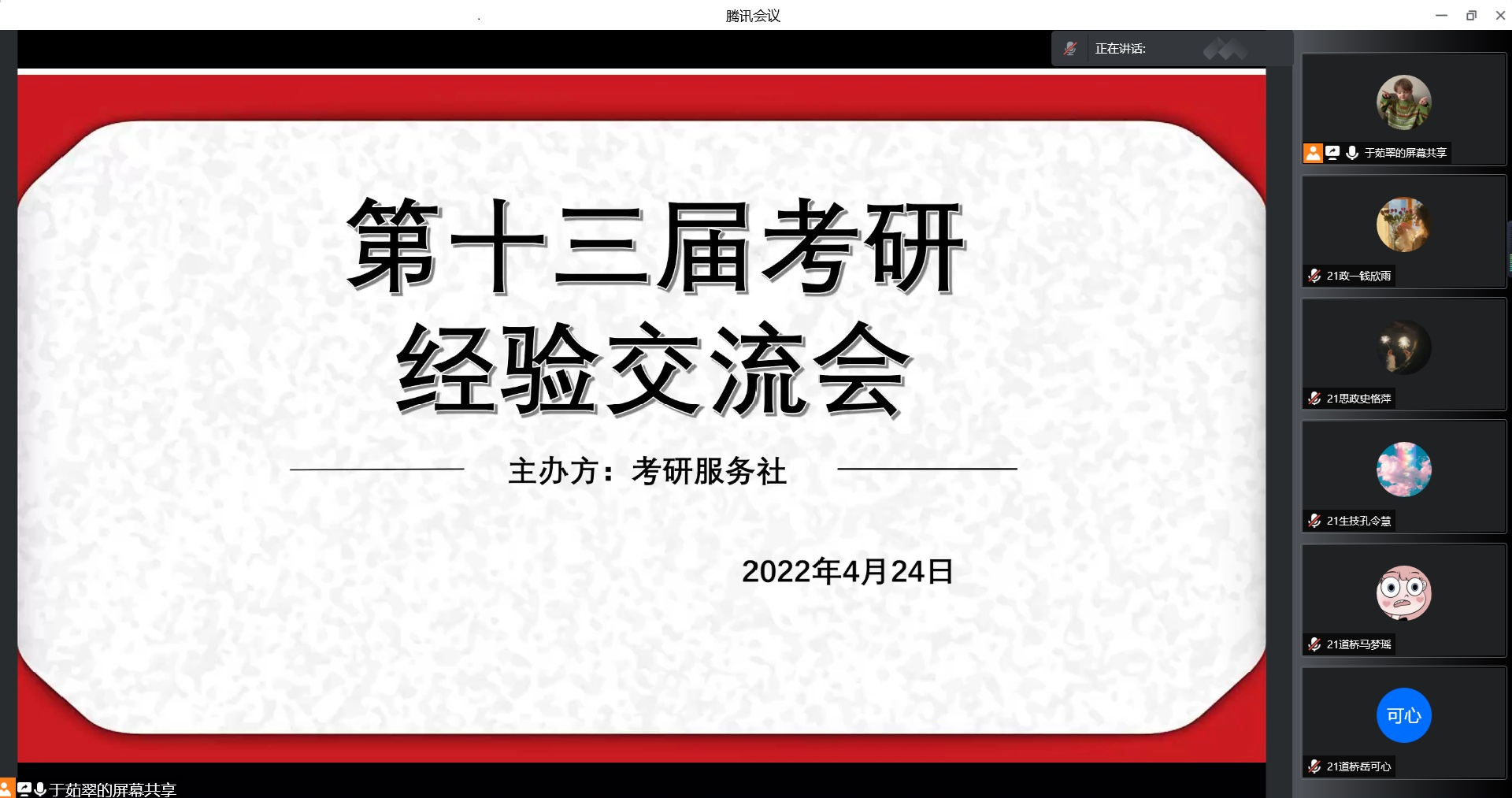 4月24日晚,考研服务社在腾讯会议召开第十三届考研经验交流会。beat365在线唯一官网党委副书记黄煌、团委书记曹栋、4位优秀考研学子及百名学生共同参与本次交流会。会议由考研服务社社长于茹翠主持。