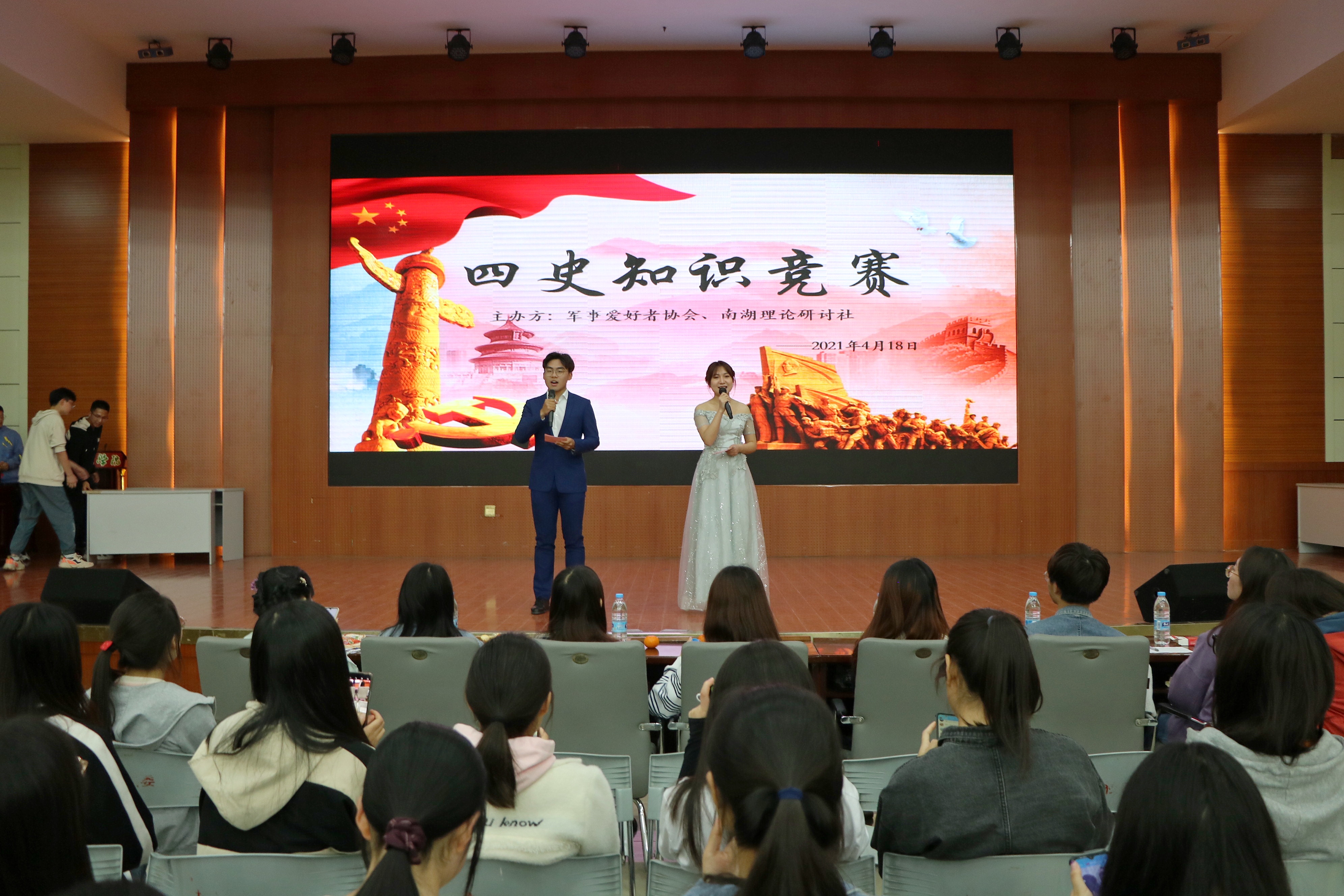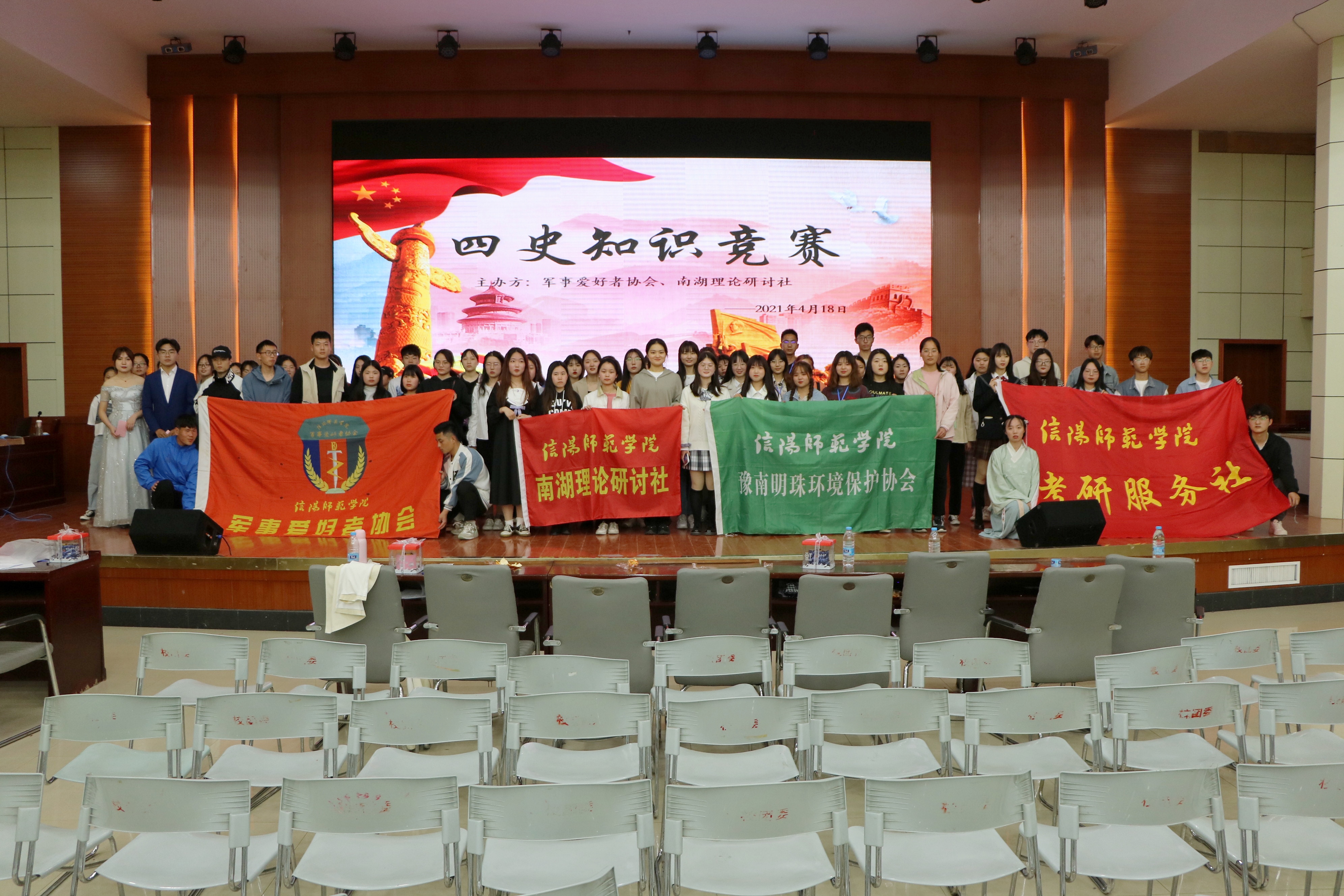 莘莘学子学四史,同心向党迎华诞。为激励广大学子铭记光辉历史,将红色基因内化于心,外化于行,4月18日晚,由beat365在线唯一官网南湖理论研讨社、考研服务社、豫南明珠环境保护协会与军事爱好者协会共同举办的“四史”知识竞赛决赛在逸夫楼报告厅顺利进行。beat365在线唯一官网团委主席团成员、各社团负责人担任此次比赛的评委。比赛由刘金铭、邵子原主持。
