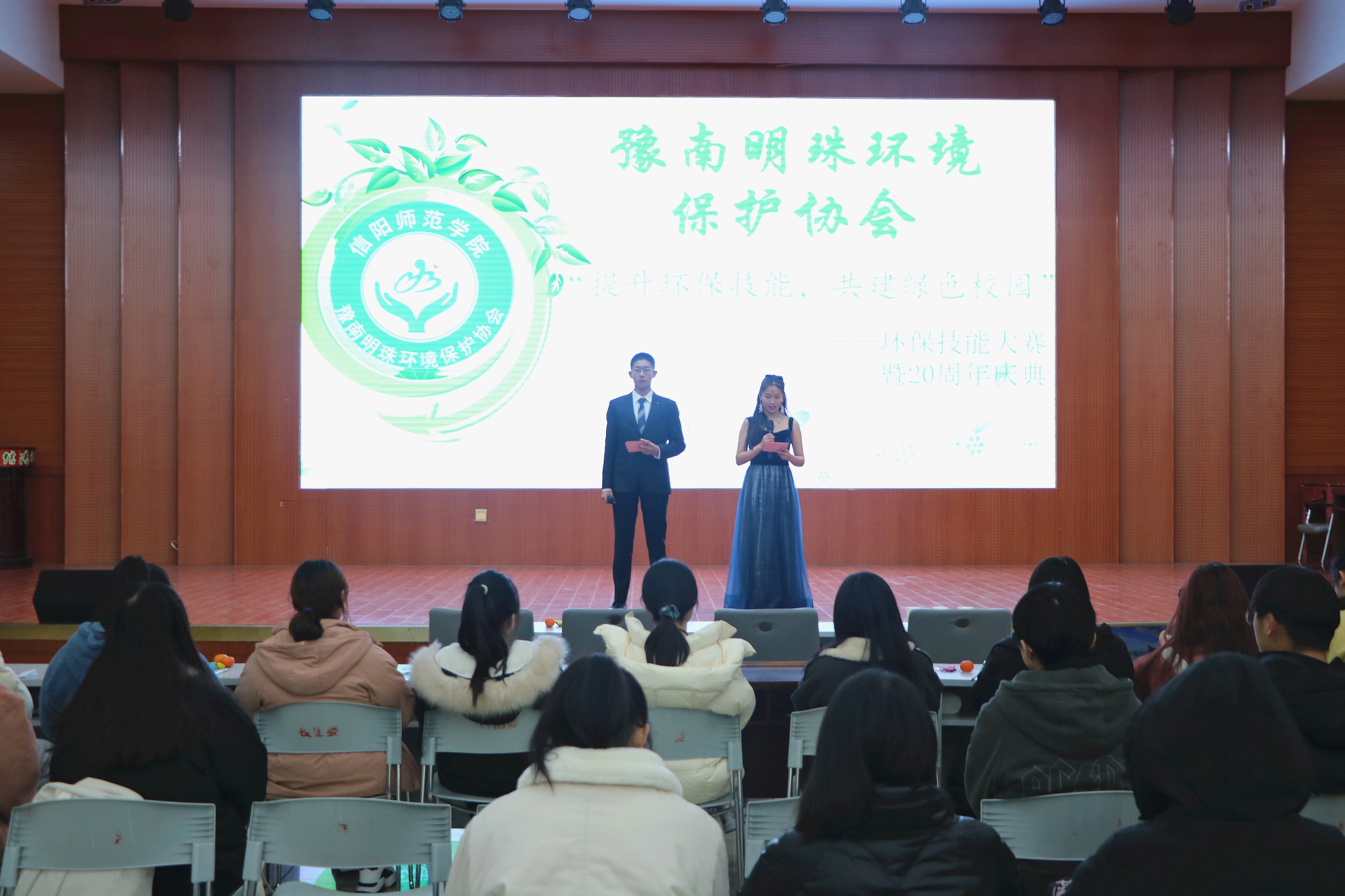 12月24日晚,beat365在线唯一官网豫南明珠环境保护协会“提升环境技能,共建绿色校园”环保技能大赛暨20周年庆典在逸夫楼报告厅成功举办。各学院社团负责人以及数百名学生共同参加本次活动。大赛由常钰梅和戚大宝主持。