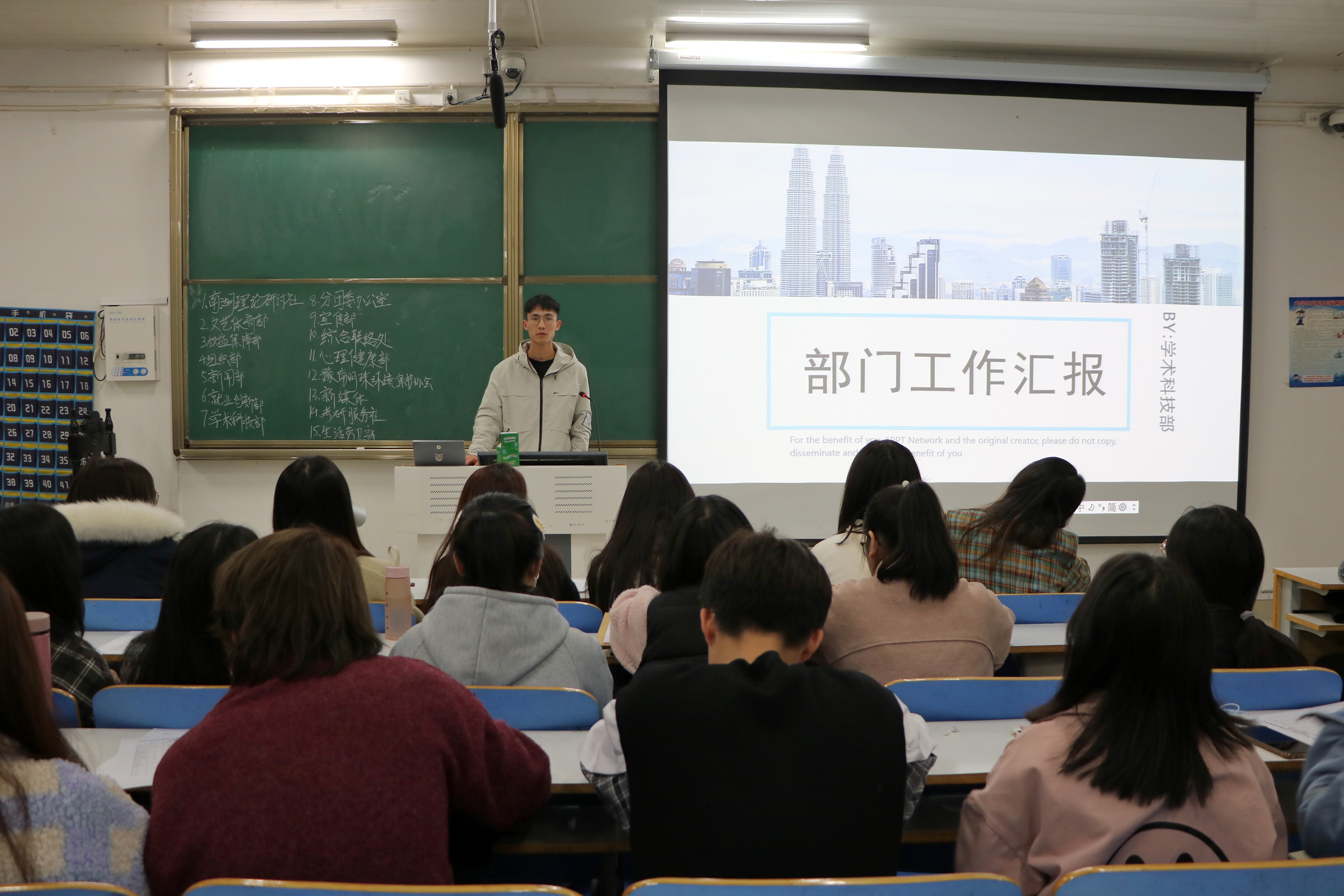会上,文艺体育部、权益保障部、新闻部、南湖理论研讨社等15个部门及社团负责人依次上台进行工作汇报。他们运用PPT展示,围绕部门简介、部门工作、反思总结、未来展望等方面进行汇报。在上学年的工作中,各部门、社团认真履行职责,按时完成本职工作,积极与其他学院分团委学生会部门进行学习交流,不断总结优秀经验,提升自身工作能力。同时,各部门、社团负责人对上学年部门工作中存在的工作效率不高、缺勤等问题进行了自我检讨与反思。他们表示,在以后的工作中,会继续坚持为学院服务,为学生服务的原则,认真完成学院交代的每一项任务。此次分团委学生会联评采取综合评分制度,会后,由分团委收集评分表并进行分数汇总公布。
