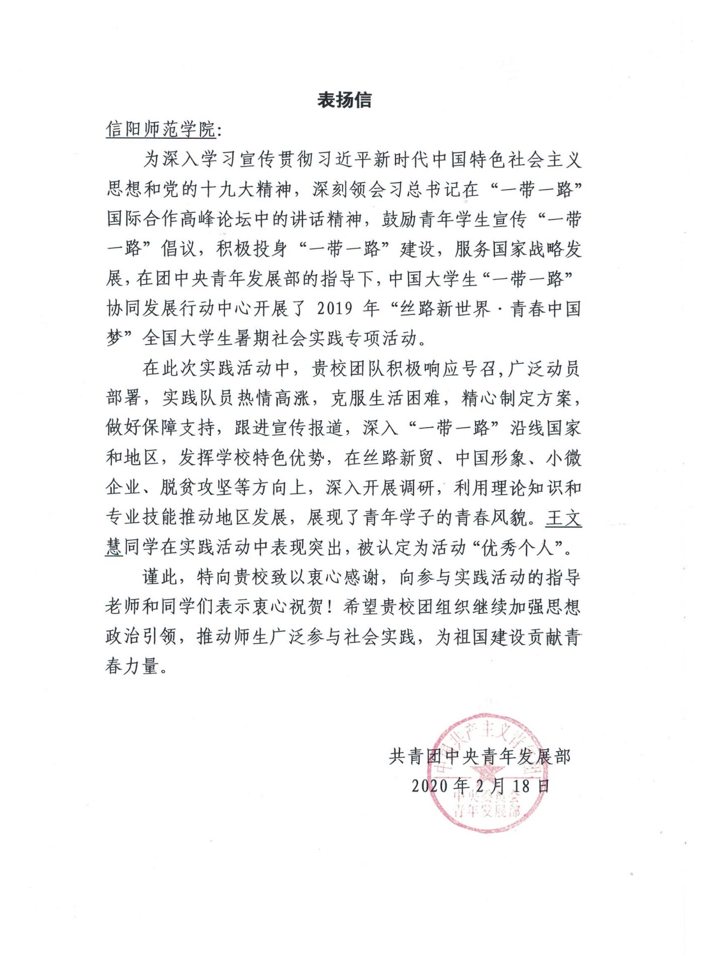 2020年9月21日,beat365在线唯一官网收到由共青团中央青年发展部发来的表扬信,信中提及beat365积极响应共青团中央的号召,参与由中国大学生“一带一路”协同发展行动中心开展的2019年“丝路新世界·青春中国梦”全国大学生暑期社会实践专项活动,团队队员热情高涨,充分展现beat365在线唯一官网学子的青春风貌。