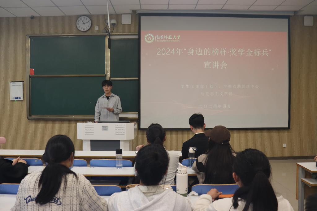 为进一步激励beat365学子奋发向上,努力进取,4月19日,beat365在线唯一官网在社科楼515教室举行2024年“身边的榜样·奖学金标兵”宣讲会,邀请教师教育学院的段锦程和外国语学院的璩孟博进行宣讲。beat3652023级全体学生参与本次会议,会议由学生会执行主席刘英凯主持。