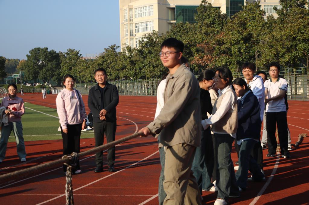 本次趣味运动会的活动共分为四个项目:抢凳子,踢毽子,跳大绳,拔河。这四个项目兼具运动性和趣味性,要求同学们相互信任,配合默契。其中,拔河比赛考验双方力量感、技巧性、协作性,在比赛开始前,王超和陶青青向双方学生传授经验,为比赛加油鼓劲。一声哨响比赛拉开帷幕,双方队员迅速进入状态,他们紧握绳索,身体后倾,双脚发力,动作尽显力量与决心。赛场旁,同学们呐喊助威声此起彼伏,为赛事增添热烈氛围。最终经过多轮较量,2024级思政一班凭借顽强毅力和出色的团队协作勇夺冠军。活动结束后,王超指出,本次活动丰富了同学们的周末生活,进一步培育了同学们的团队精神,同时也响应了习近平总书记“每天锻炼一小时”的号召,是推动高校生活多样化的一次重要实践。