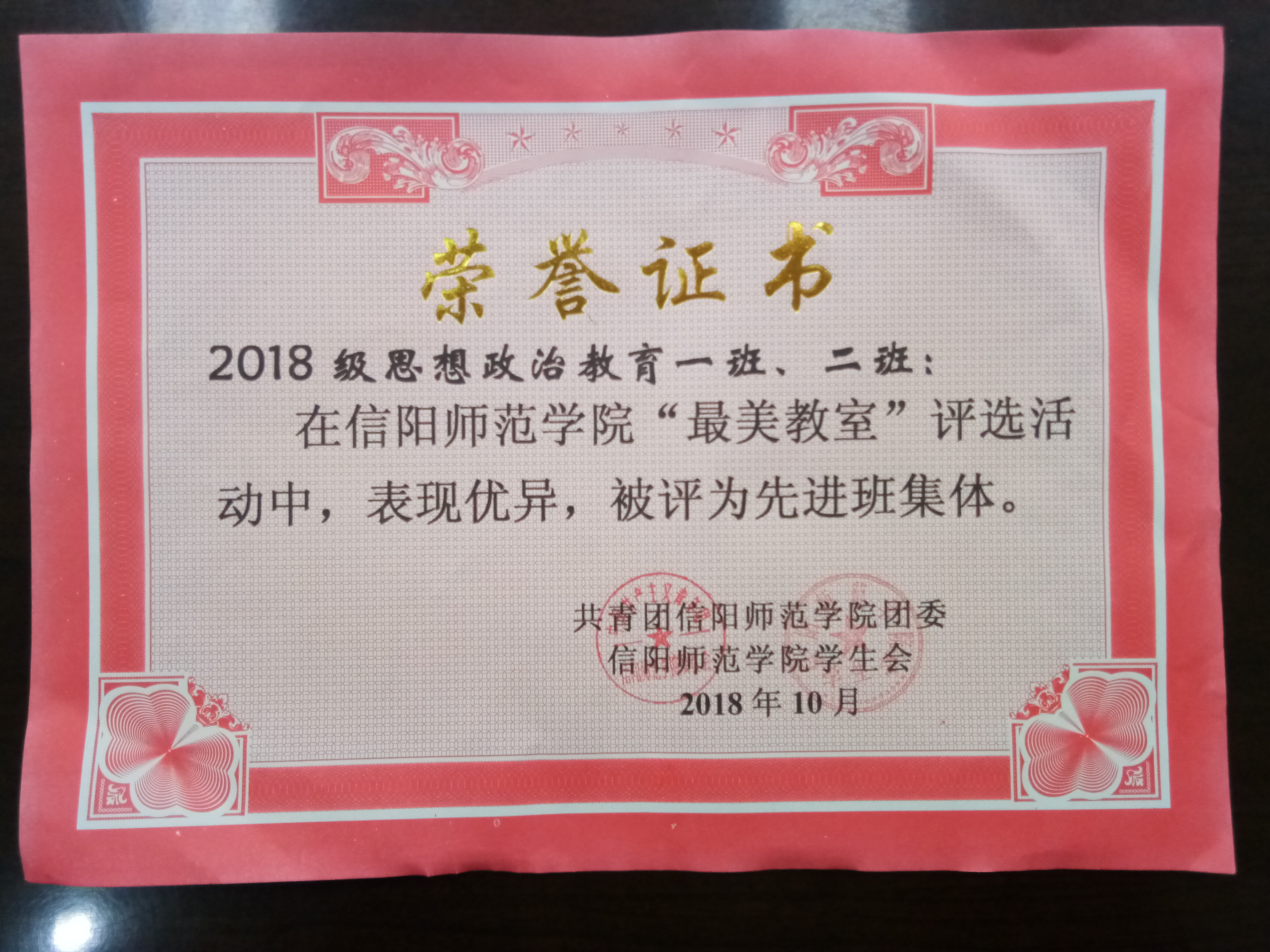 根据我校“最美教室”评选活动标准,beat3652018级思想政治教育一班、二班积极配合学校工作,打扫教室耐心认真,表现出色,被评为先进班集体。