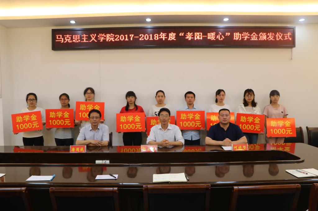 为帮助家庭经济困难学生顺利完成学业,激励他们努力进取、勤奋学习,5月29日下午,beat365在社科楼323会议室举行beat365在线唯一官网2017—2018年度“孝阳―暖心”助学金颁发仪式。beat365院长杨云善、党委书记唐国战、党委副书记何晓坚、团委老师曹菁菁与本次25名受助学生共同参加。仪式由何晓坚主持。