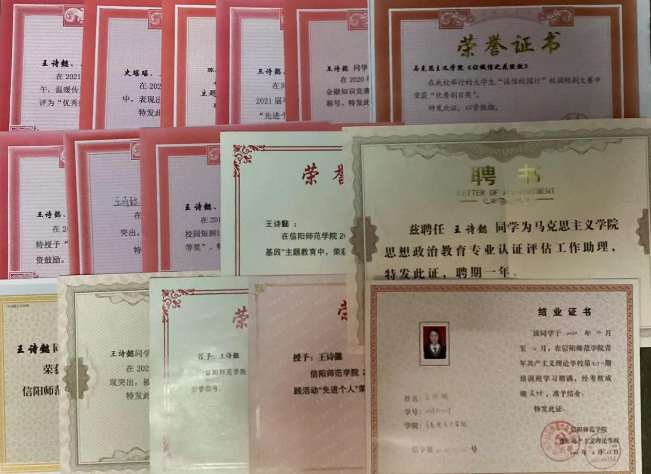 在学习方面,该生勤奋刻苦,善于思考,坚持练就过硬本领,努力提高科学文化水平,时刻把学习当作自己的第一任务,积极投入到各门基础课和专业课的学习中,并不断提高自身写作能力,积极撰写《在抗疫中书写奋斗青春》、《以高尚人格增添思政课教师魅力》等文章,并在《南湖评论》上发表。2019-2020学年荣获校级三等奖学金,顺利通过英语四级考试、普通话水平测试。不仅注重专业知识学习,而且注重提升综合能力,积极参加广播体操比赛、微团课比赛、南湖理论研讨社主题征文活动、学生会夜跑活动、“丹青墨韵”摄影美术作品大赛、仁杰工作室笔锋征文活动,参演了新生联谊晚会和2020年元旦晚会。2019年,参加学院“诚信校园行”校园短剧比赛中,荣获一等奖;2020年,参加法学与社会学学院手帐比赛获得二等奖;参加计算机学院“疫中成长分享你我的故事”比赛中获得手账组二等奖;参加beat365在线唯一官网“诚信伴我行”线上金融征信知识竞赛获得二等奖;2021年,参加信阳师范学院“拼贴手账,我手秀我型”活动,荣获“三等奖”;参加“莘莘学子学四史,同心向党迎华诞”主题活动,被评为“优秀工作者”;被评为信阳师范学院2021年度三好学生。
